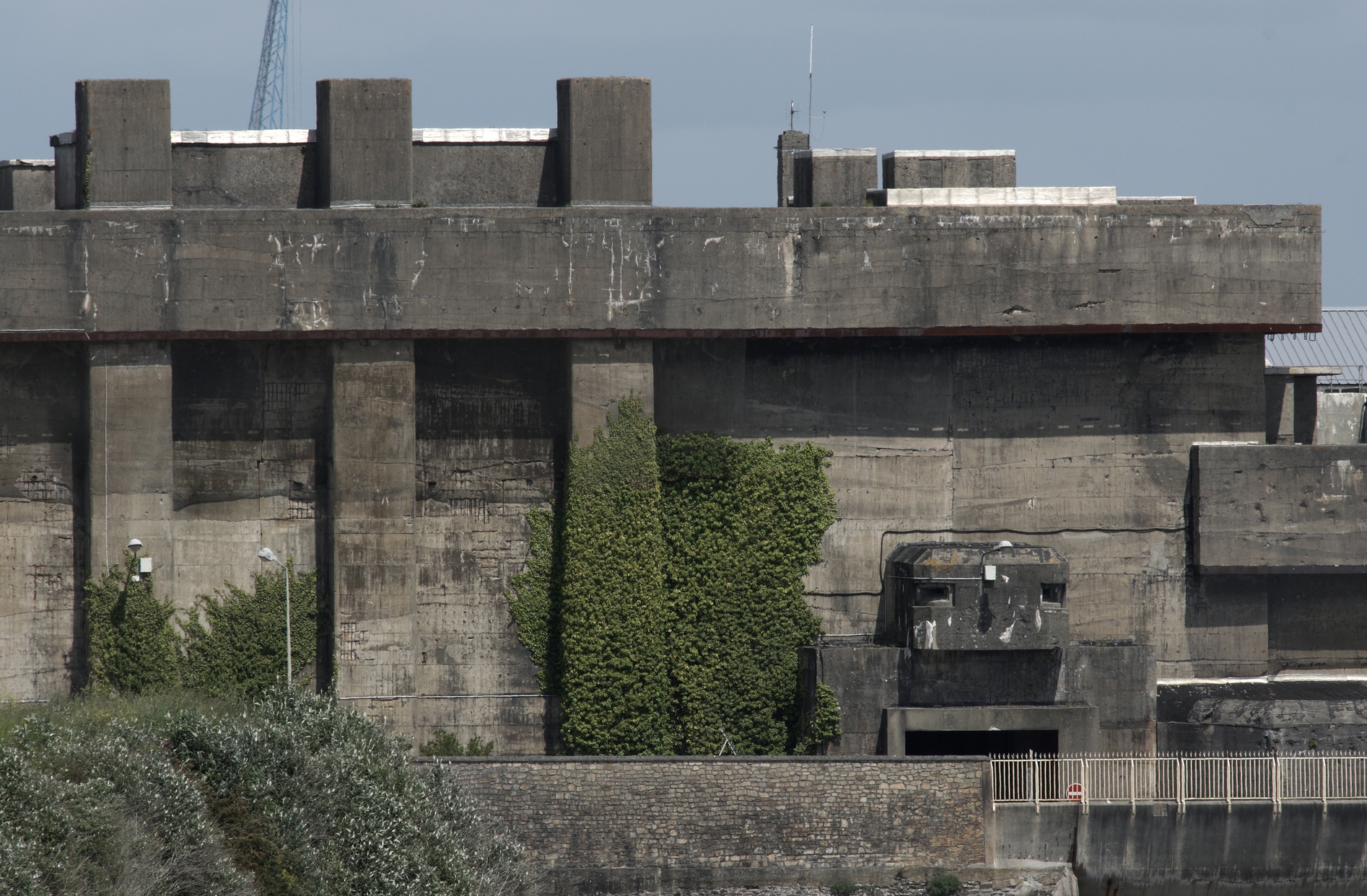 Vue de la base de sous-marins : détail du front sud-ouest, entrée ouest et dalle de couvertureImmatriculation
