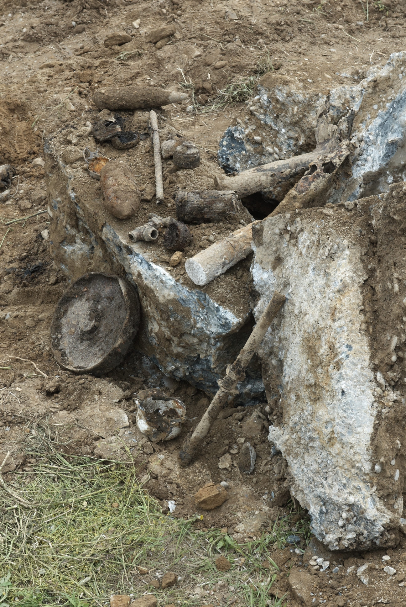 Objets et matériels pyrotechniques (obus de différents types, gargousses, cartouches et étuis de masque à gaz...) découverts lors de la déconstruction des bunkersImmatriculation