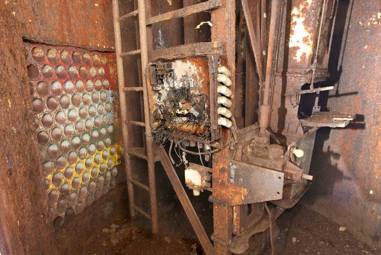 Vue intérieure de l'abri sud pour mortier de type 664 (B116) : palier intermédiaire, casier à munitions. Les couleurs correspondent aux différents types de munitionsImmatriculation