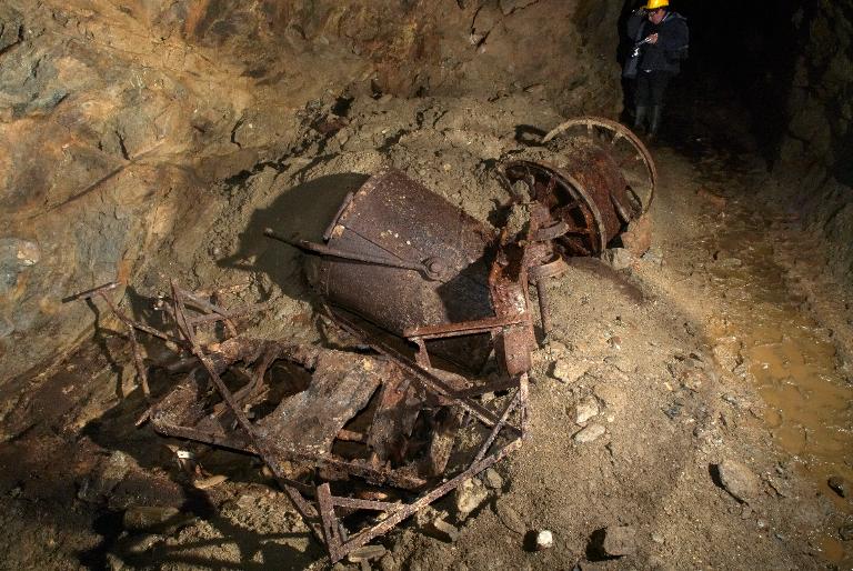 Vue du réseau de galeries souterraines allemandes reliant les bunkers du Stützpunkt Marineschule : au sol, vestiges de wagonnets pour voie étroite (60 cm), grands récipients et débris métalliques...Immatriculation