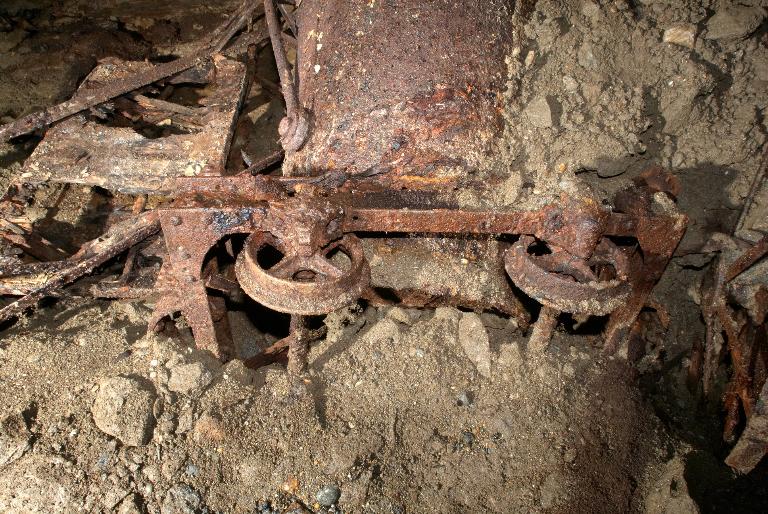 Vue du réseau de galeries souterraines allemandes reliant les bunkers du Stützpunkt Marineschule : au sol, vestiges de l'un des wagonnets pour voie étroite (60 cm)Immatriculation