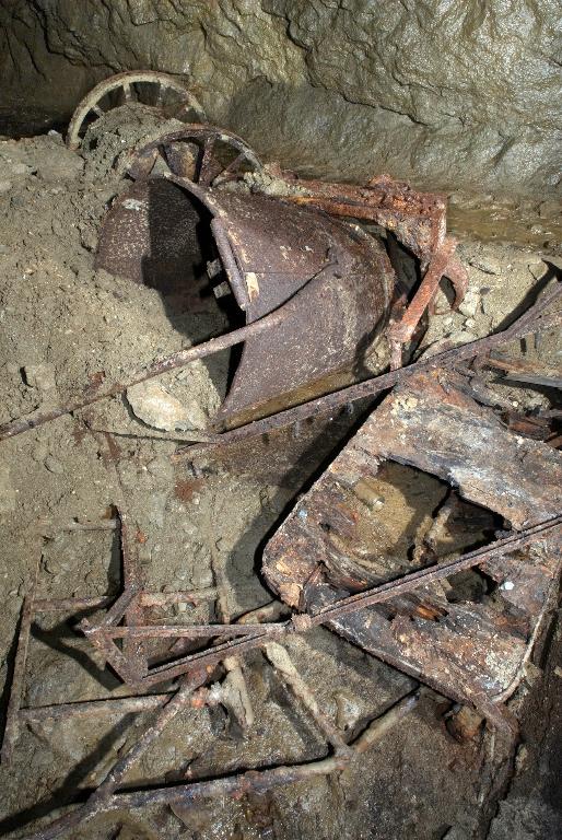 Vue du réseau de galeries souterraines allemandes reliant les bunkers du Stützpunkt Marineschule : au sol, vestiges de wagonnets pour voie étroite (60 cm), grands récipients et débris métalliques...Immatriculation
