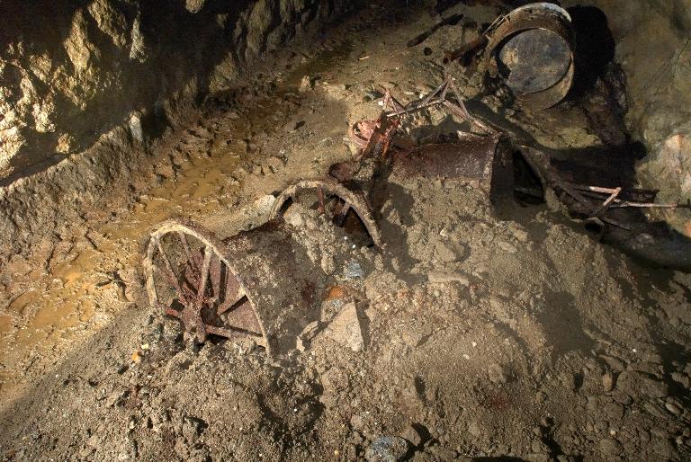 Vue du réseau de galeries souterraines allemandes reliant les bunkers du Stützpunkt Marineschule : au sol, vestiges de wagonnets pour voie étroite (60 cm), grands récipients sur roues et débris métalliques...Immatriculation