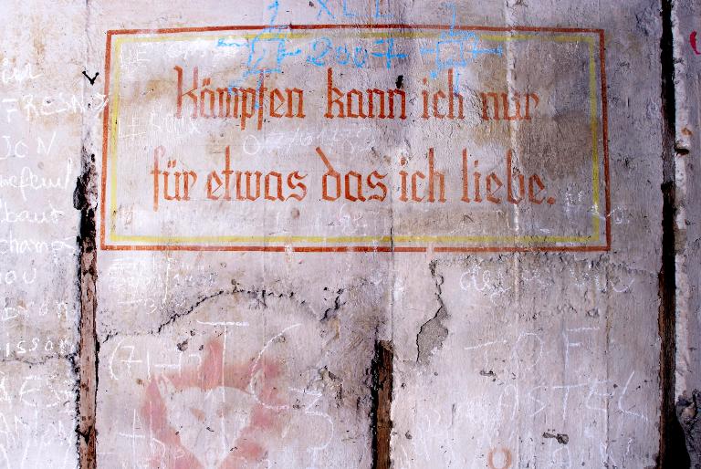 Vue du réseau de galeries souterraines allemandes reliant les bunkers du Stützpunkt Marineschule : peinture murale de propagande sur le mur d'un bunkerImmatriculation