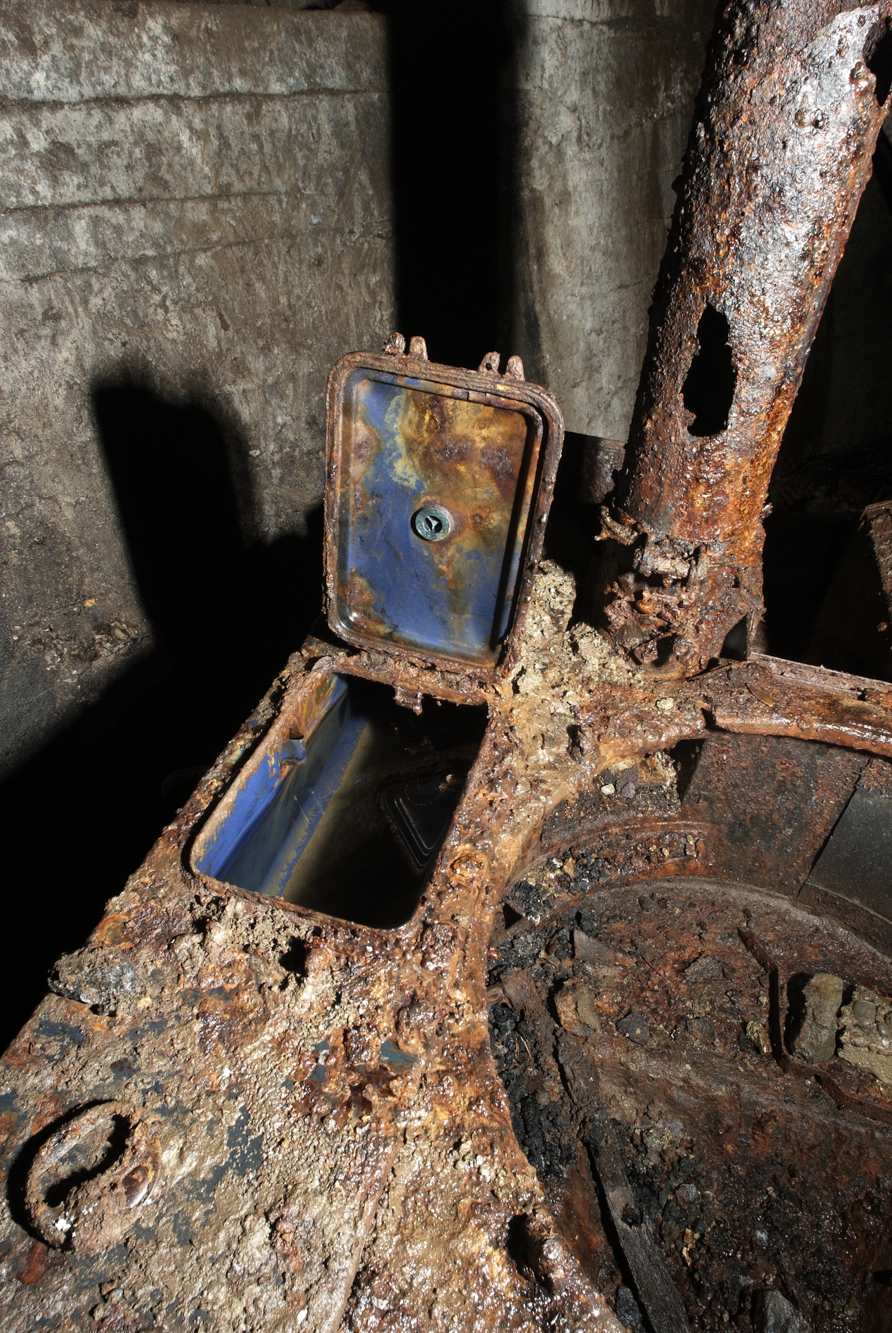 Vue du réseau de galeries souterraines allemandes reliant les bunkers du Stützpunkt Marineschule : l'une des quatre alvéoles de l´abri central. Au sol, cuisine roulante et sa marmite...Immatriculation