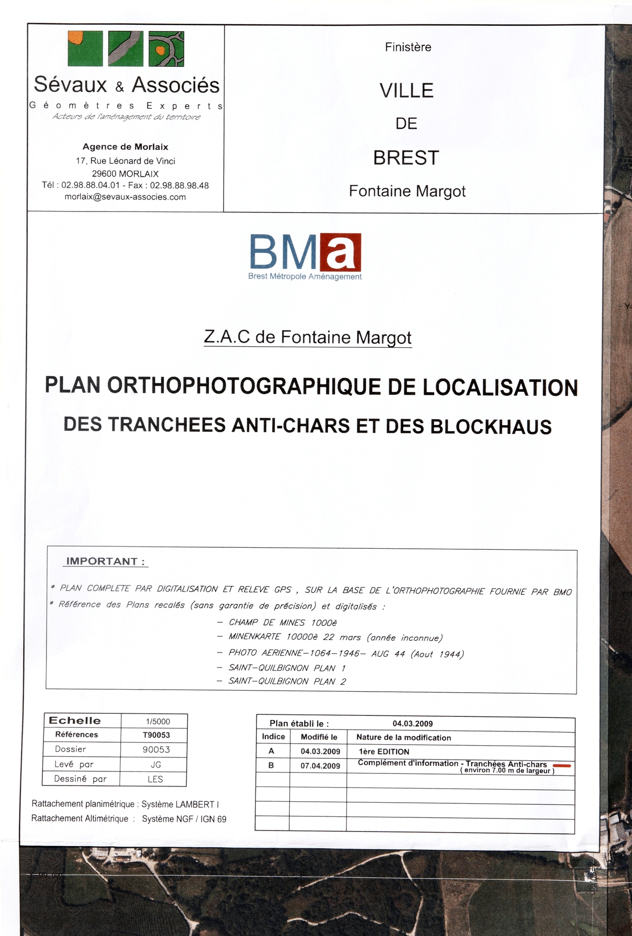 Brest, Zone d'aménagement concerté (ZAC) de Fontaine Margot : plan orthophotographique des tranchées antichars et des blockhaus (Ville de Brest, 4/03/2009)Immatriculation