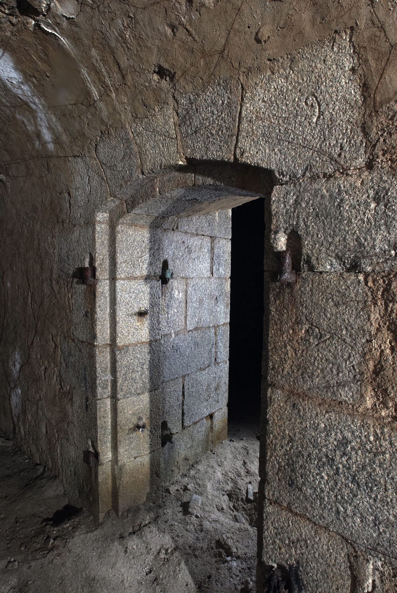 Brest : le fort de Penfeld, magasin à poudre, porte, piédroit portant des marques de tâcheron, photographie réalisée le 13 mai 2009Immatriculation