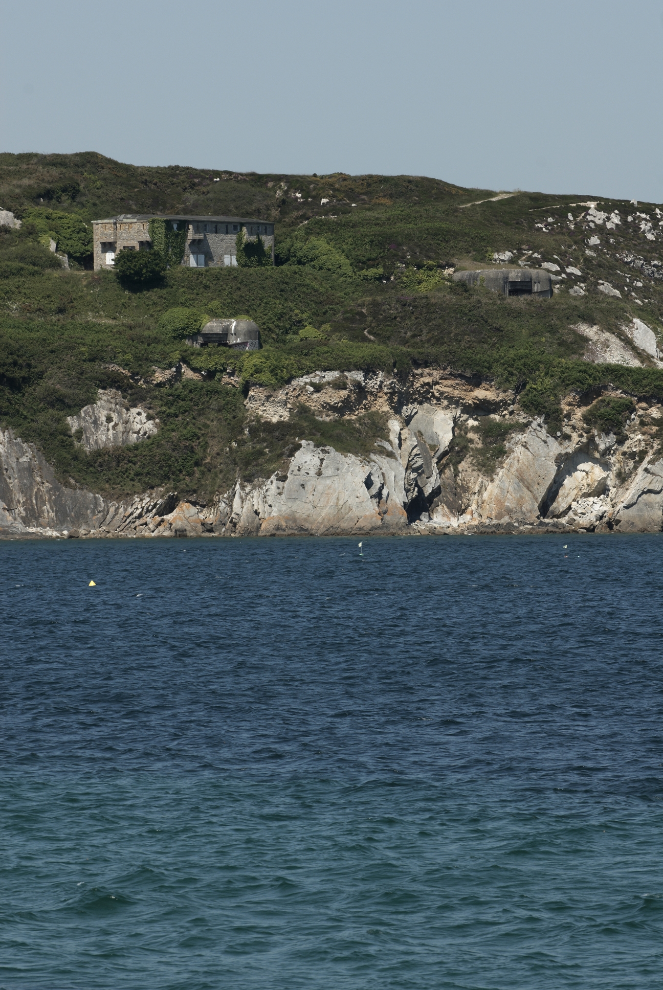 Vue de la pointe du Petit Gouin depuis la mer : corps de garde crénélé et batterie sous bunkers - casemates de type 671 (2 x 7,5 cm)Immatriculation