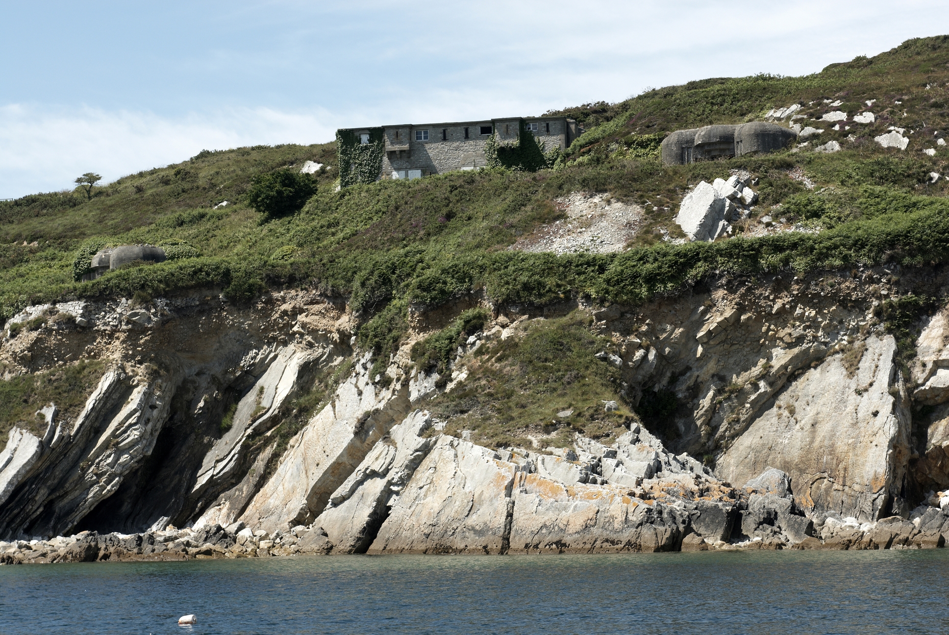 Vue de la pointe du Petit Gouin depuis la mer : corps de garde crénélé et batterie sous bunkers - casemates de type 671 (2 x 7,5 cm)Immatriculation