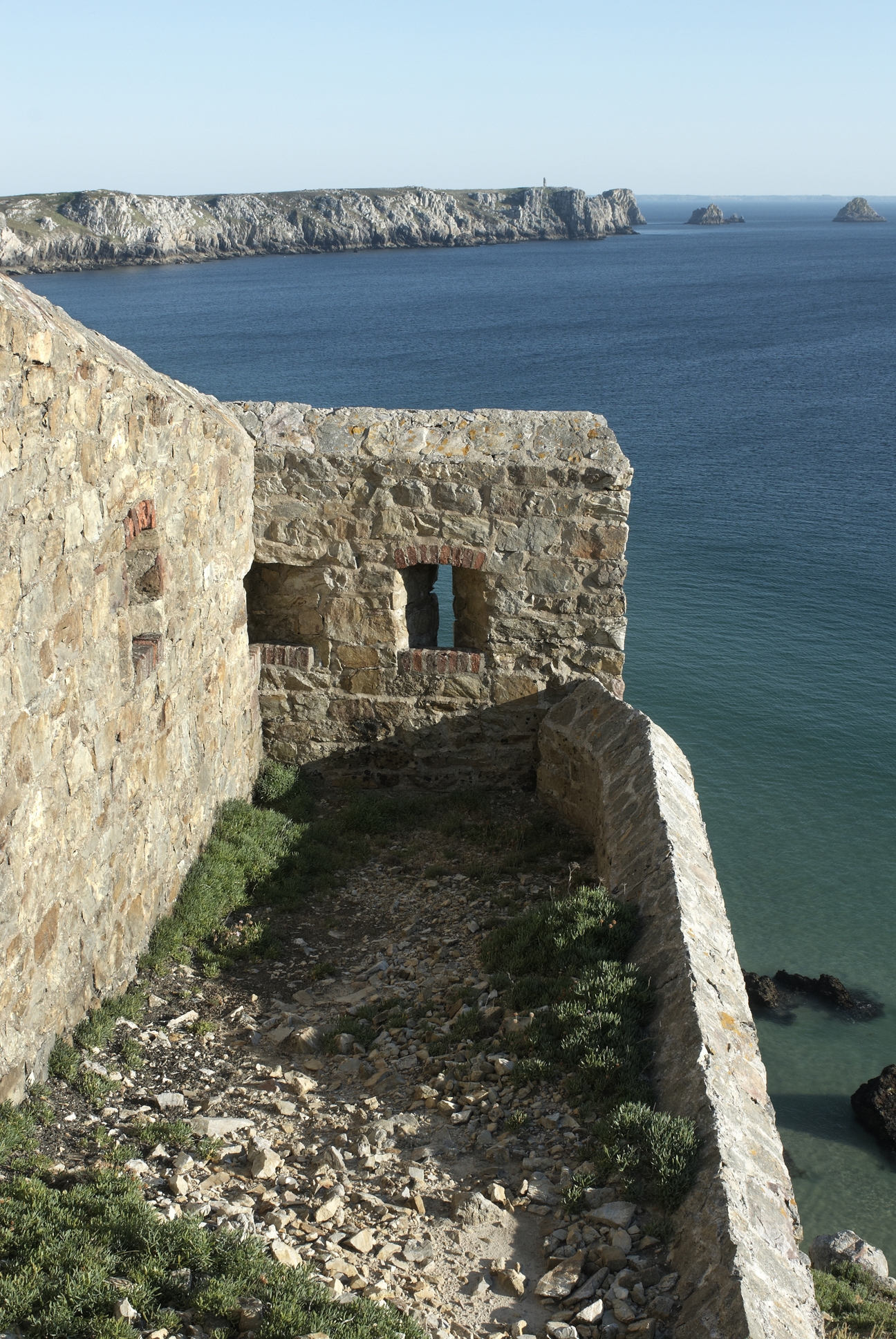 Camaret-sur-Mer, pointe du Toulinguet : vue du mur défensif percé de créneaux de fusillade. En arrière plan : la pointe de Pen HirImmatriculation