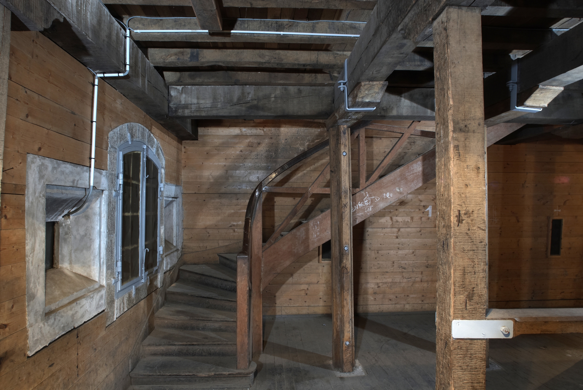 Vue intérieure de l'un des magasins à poudre de la vallée de Kerhuon à Guipavas : rez-de-chaussée, fenêtre, créneaux à lampe et escalier tournant (état en 2009)Immatriculation