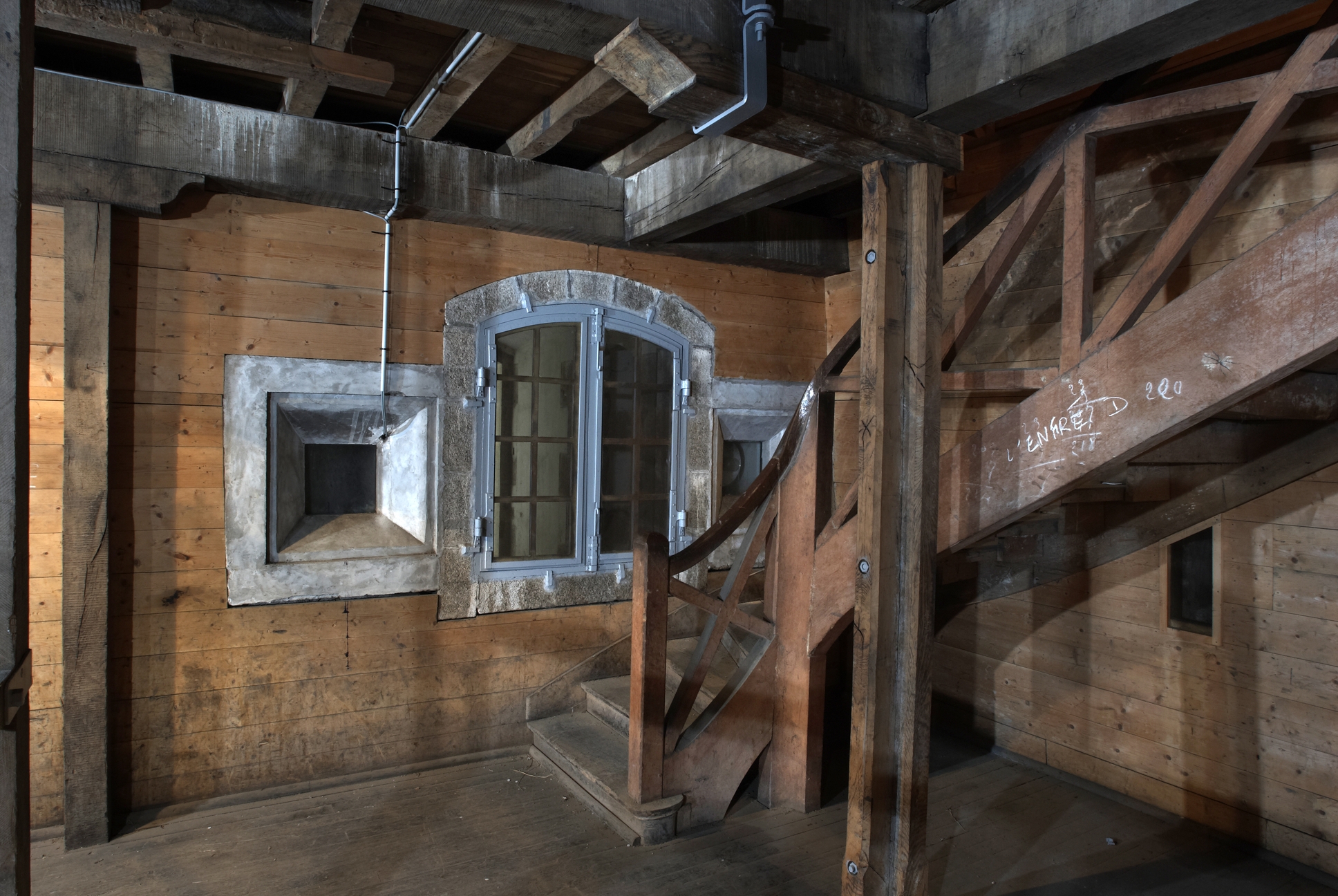 Vue intérieure de l'un des magasins à poudre de la vallée de Kerhuon à Guipavas : rez-de-chaussée, fenêtre, créneaux à lampe et escalier tournant (état en 2009)Immatriculation