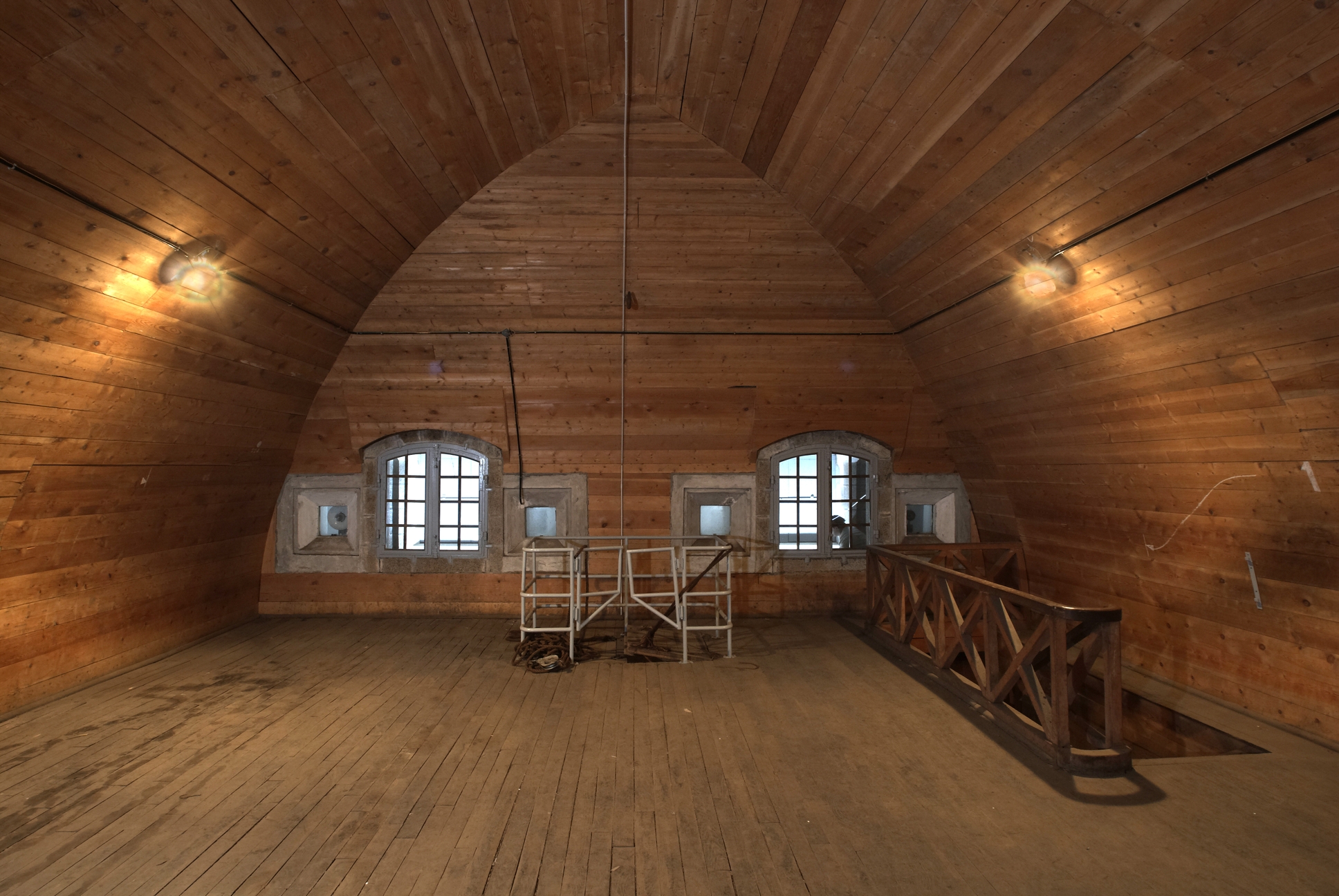 Vue intérieure de l'un des magasins à poudre de la vallée de Kerhuon à Guipavas : premier étage sous voûte lambrissée (état en 2009). Cet espace était éclairé par des fenêtres et créneaux à lampeImmatriculation