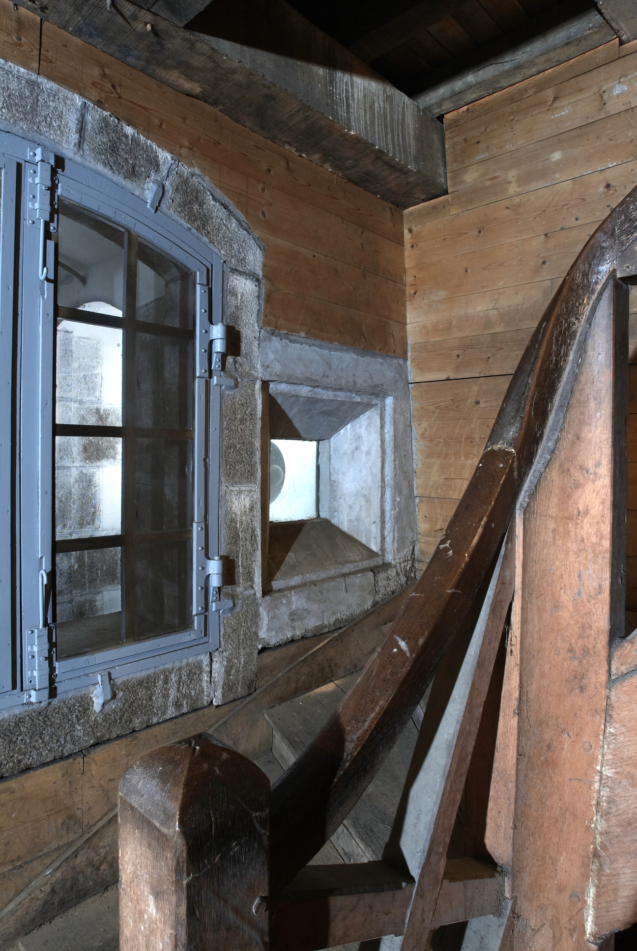 Vue intérieure de l'un des magasins à poudre de la vallée de Kerhuon à Guipavas : escalier tournant en bois, fenêtre et créneau à lampe (état en 2009)Immatriculation