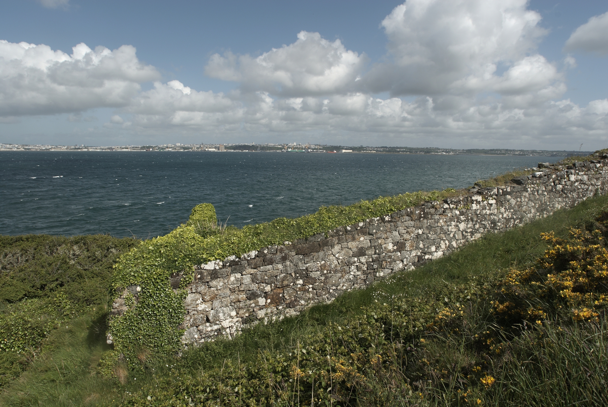 Plougastel-Daoulas, fort du Corbeau : partie basse, extrémité du mur protégeant le chemin menant à la partie hauteImmatriculation