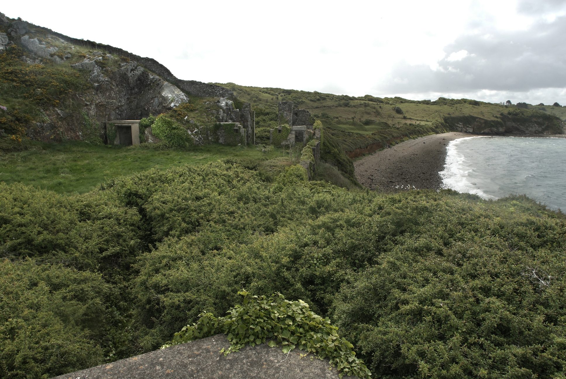 Plougastel-Daoulas, fort du Corbeau : partie basse, porte, tambour de la porte d'entrée et corps de garde de la batterie. Au centre, un peu à gauche, abri de jour du projecteurImmatriculation