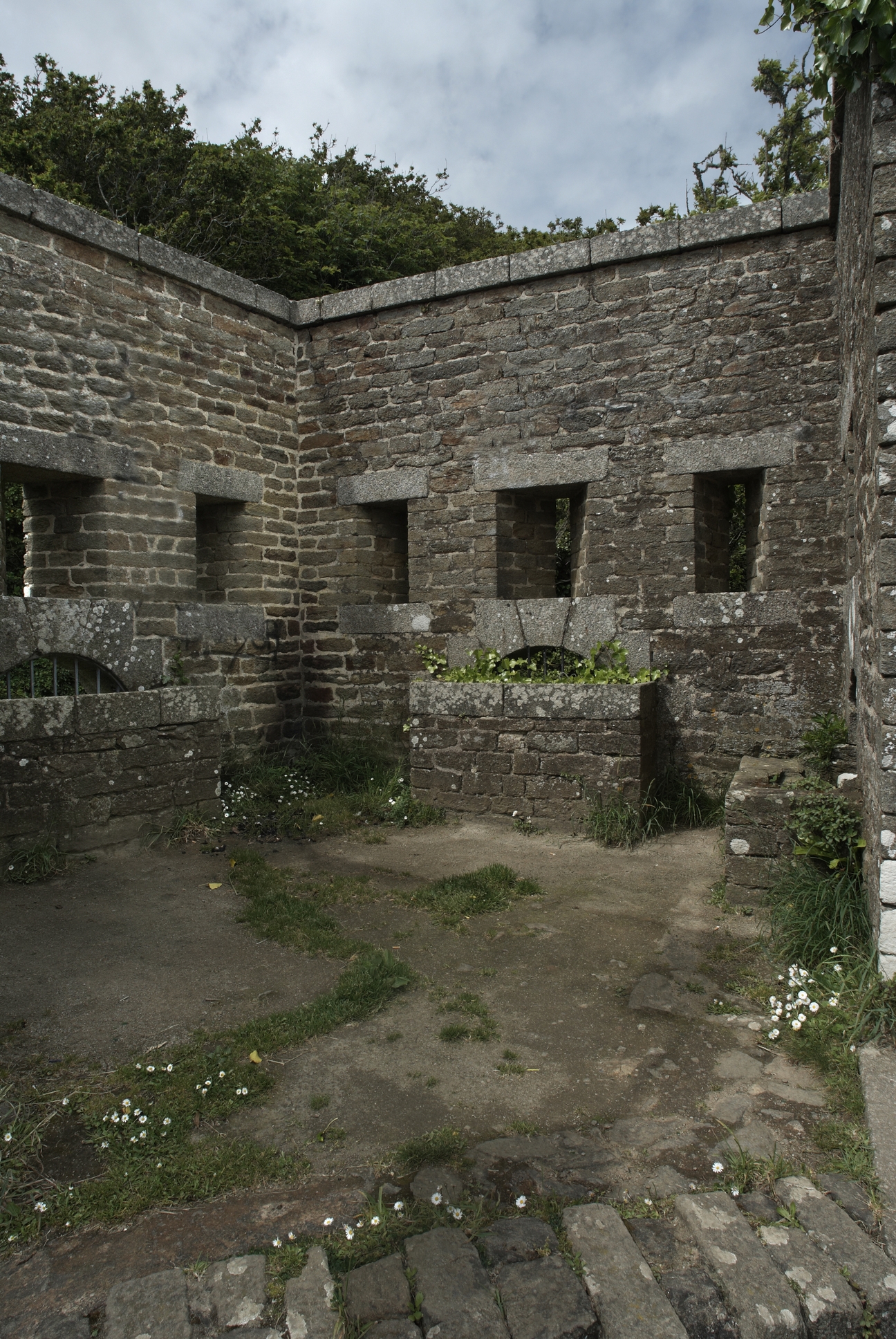 Plouzané : vue du fort du Dellec, mur d'enceinte ouest percé de créneaux de fusillade. Bastionnet à mâchicoulis ou créneaux de piedImmatriculation