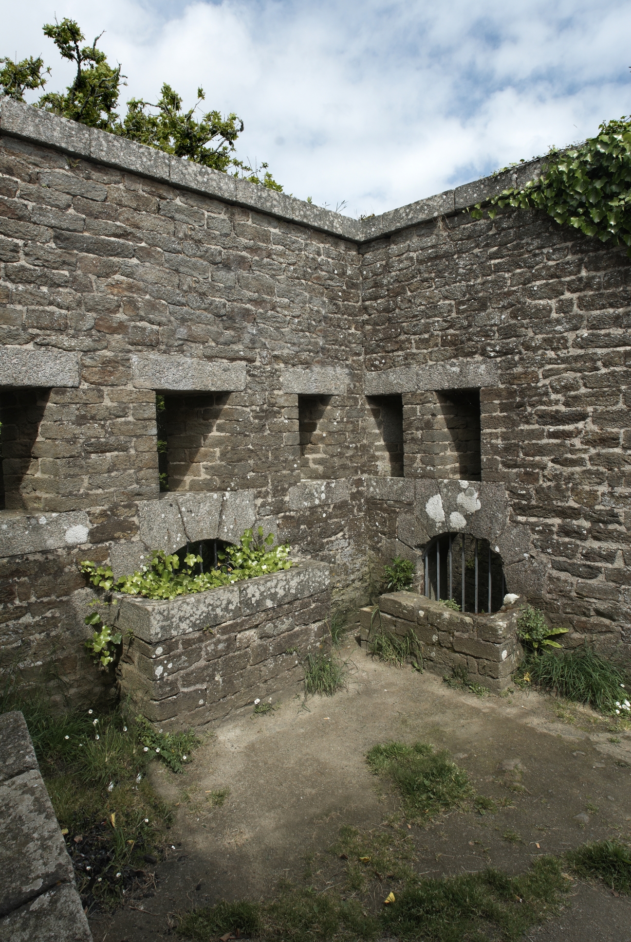Plouzané : vue du fort du Dellec, mur d'enceinte ouest percé de créneaux de fusillade. Bastionnet à mâchicoulis ou créneaux de piedImmatriculation