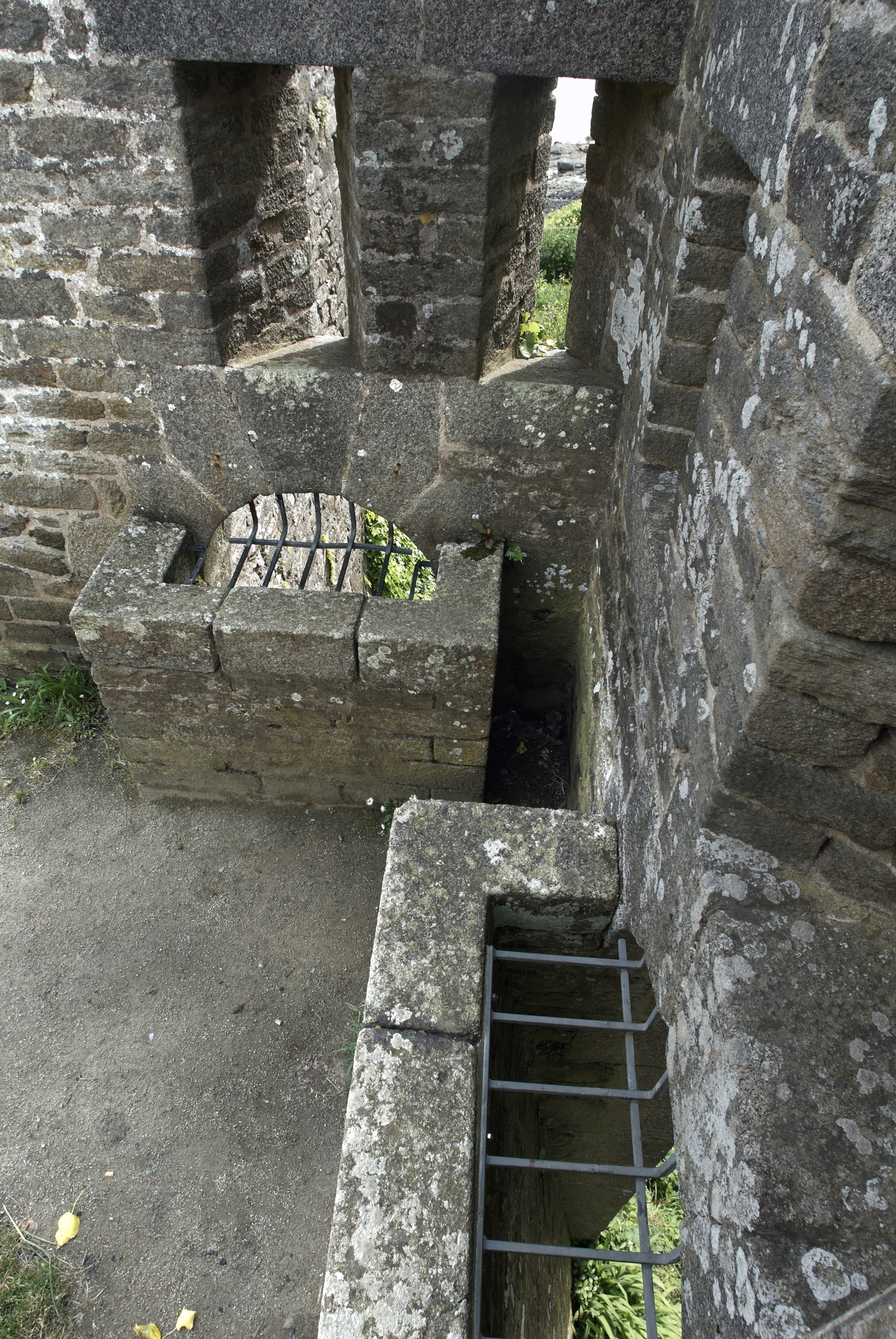 Plouzané : vue du fort du Dellec, mur d'enceinte ouest percé de créneaux de fusillade. Bastionnet à mâchicoulis ou créneaux de piedImmatriculation
