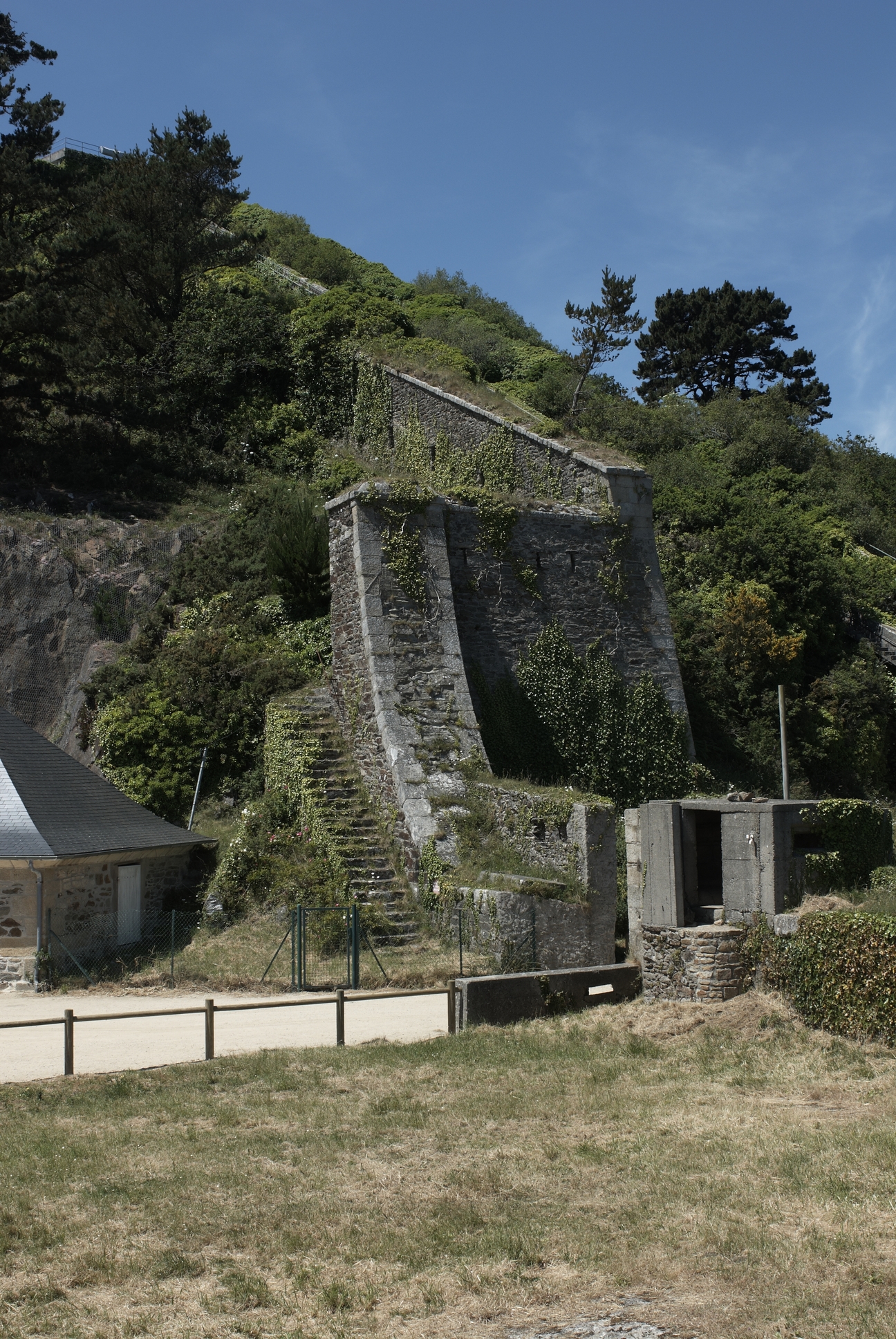 Plouzané : vue du fort du Mengant, mur d'enceinte dit branche tombante est percée de créneaux de mousqueterie et escalier parallèleImmatriculation
