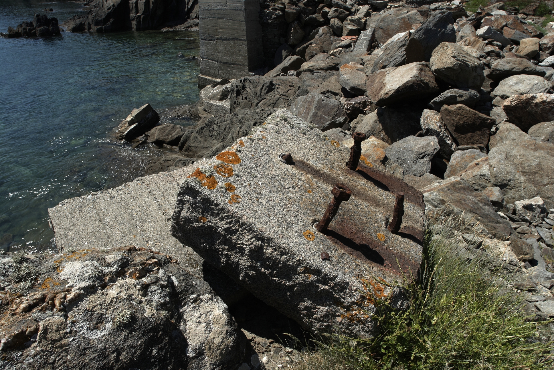 Plouzané : vue du fort du Mengant, détail de la batterie basse, extrémité ouest ruinée, dé, boulons de selletteImmatriculation