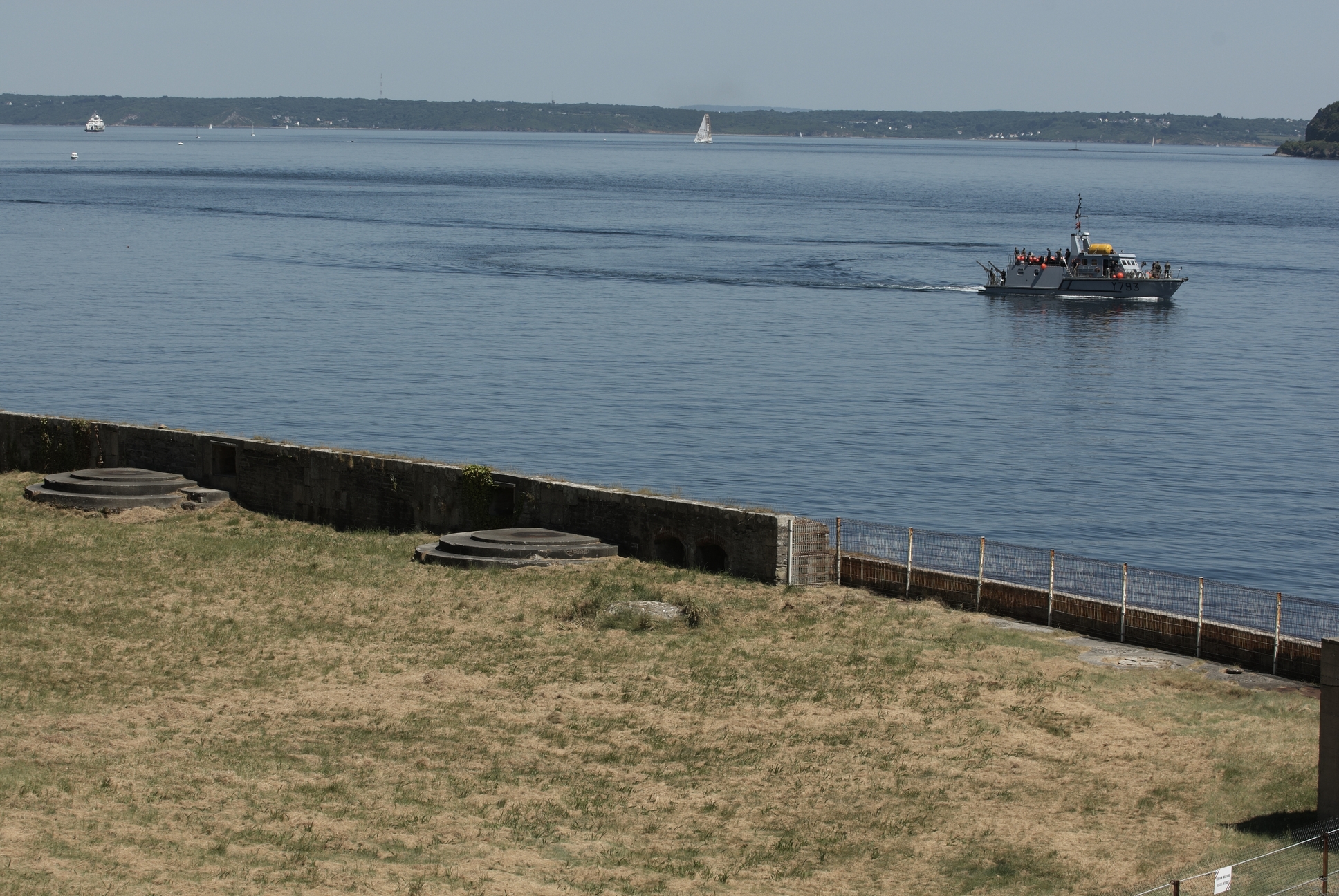 Plouzané : vedette d'intervention pour plongeurs démineurs immatriculée Y793 depuis le fort du Mengant. Au premier plan : la batterie basseImmatriculation