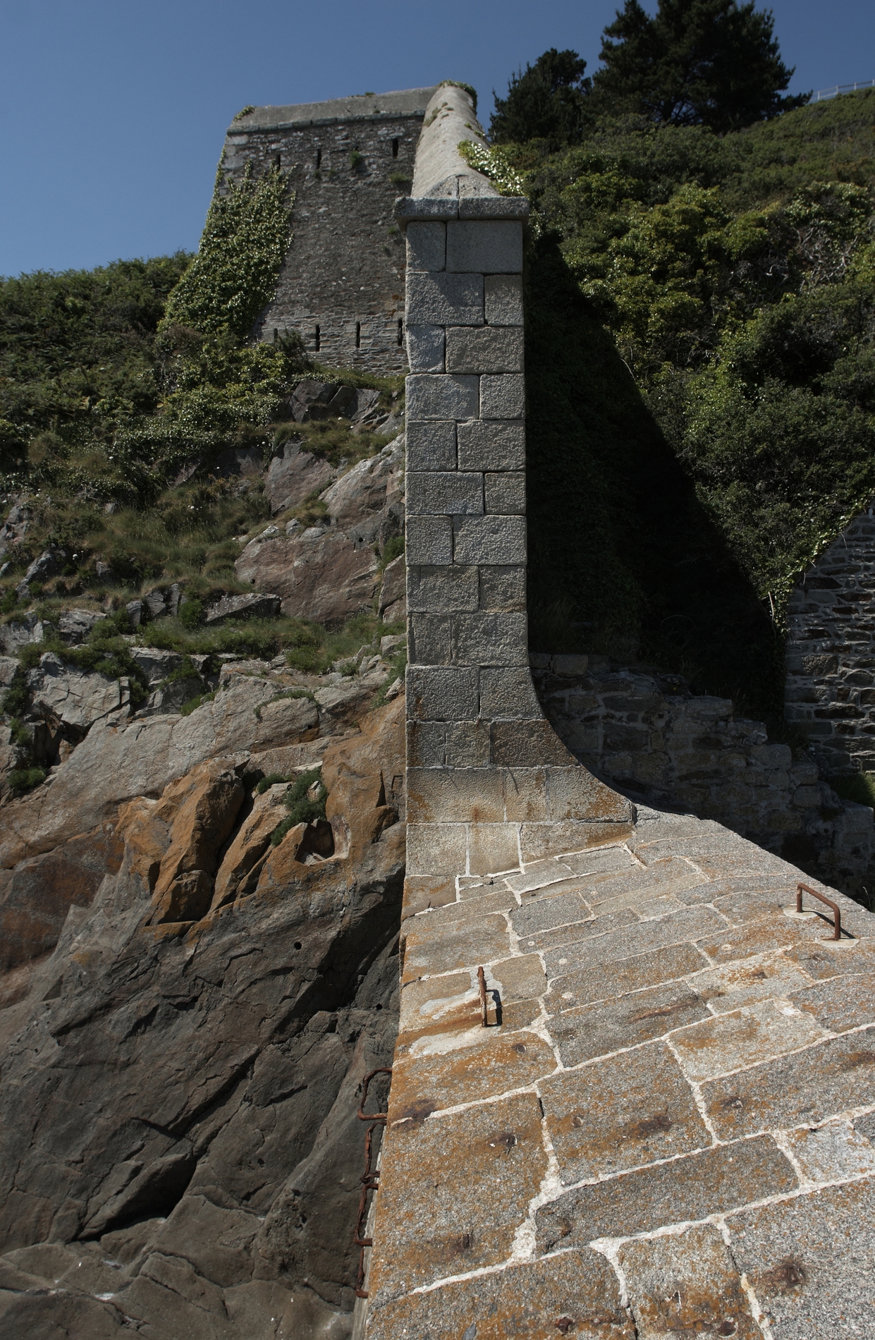 Plouzané : vue du fort du Mengant, mur d'enceinte dit branche tombante ouest percée de créneaux de mousqueterie et escalier parallèleImmatriculation