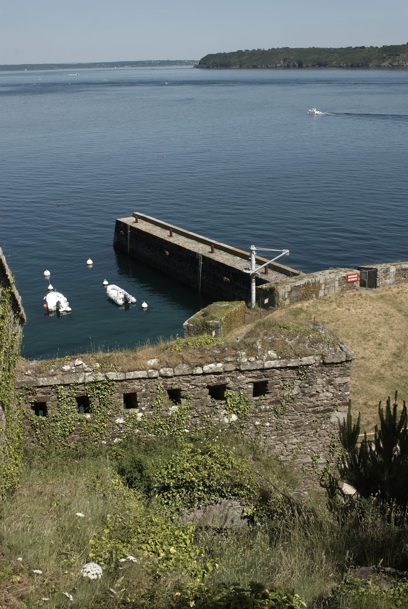 Plouzané : vue du fort du Mengant, mur d'enceinte dit branche tombante est percée de créneaux de mousqueterie et escalier parallèleImmatriculation