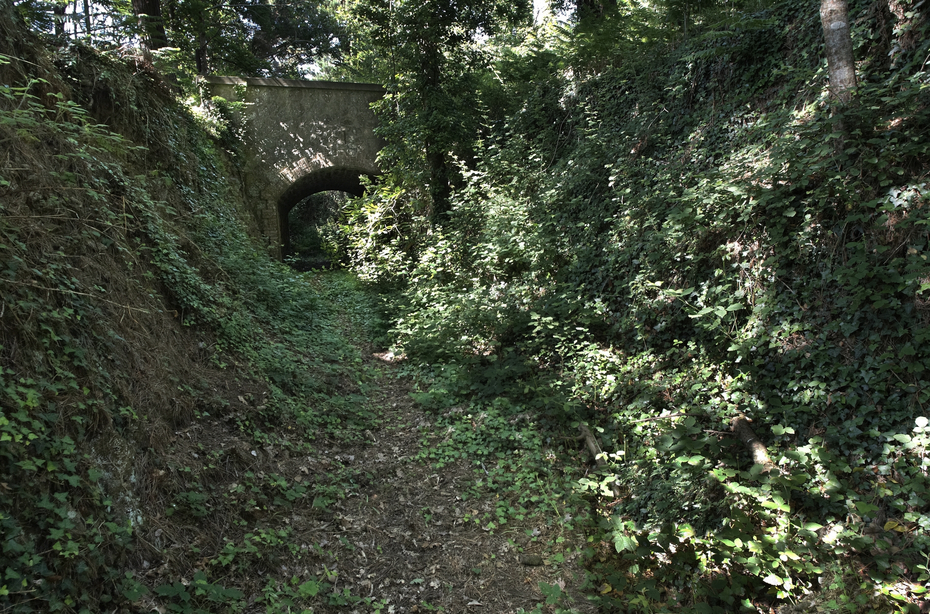 Plouzané, pointe du Minou (Kerangoff) : batterie du Sémaphore, passage couvert en tranchée permettant la communication de la batterie au magasin à poudre sous rocImmatriculation