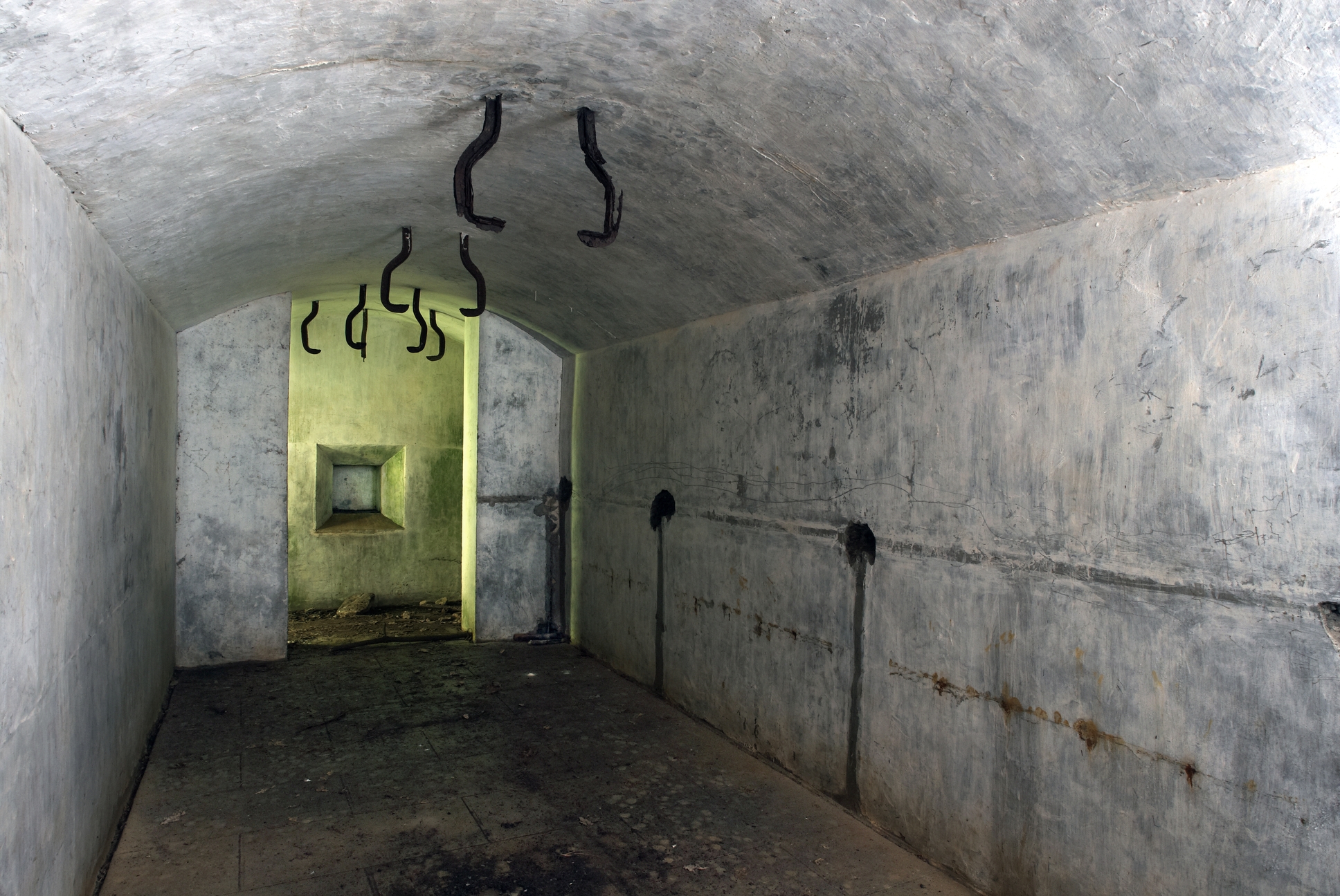 Plouzané, pointe du Minou (Kerangoff) : batterie du Sémaphore, magasin aux projectiles réalisé en béton armé (1891). Il a conservé du matériel de second oeuvre : porte, volet de ventilation et railImmatriculation
