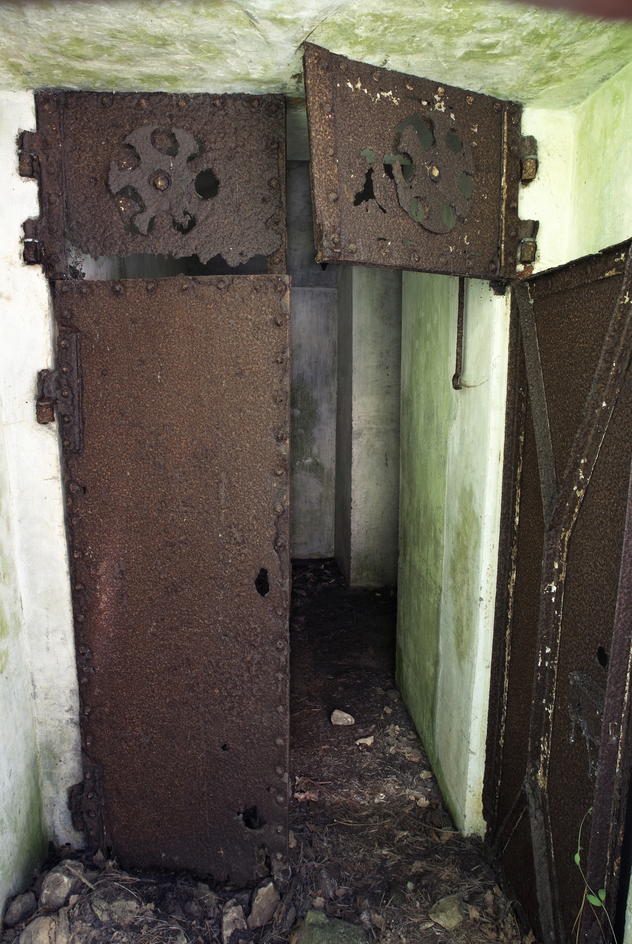 Plouzané, pointe du Minou (Kerangoff) : batterie du Sémaphore, magasin aux projectiles réalisé en béton armé (1891). Il a conservé du matériel de second oeuvre : porte, volet de ventilation et railImmatriculation