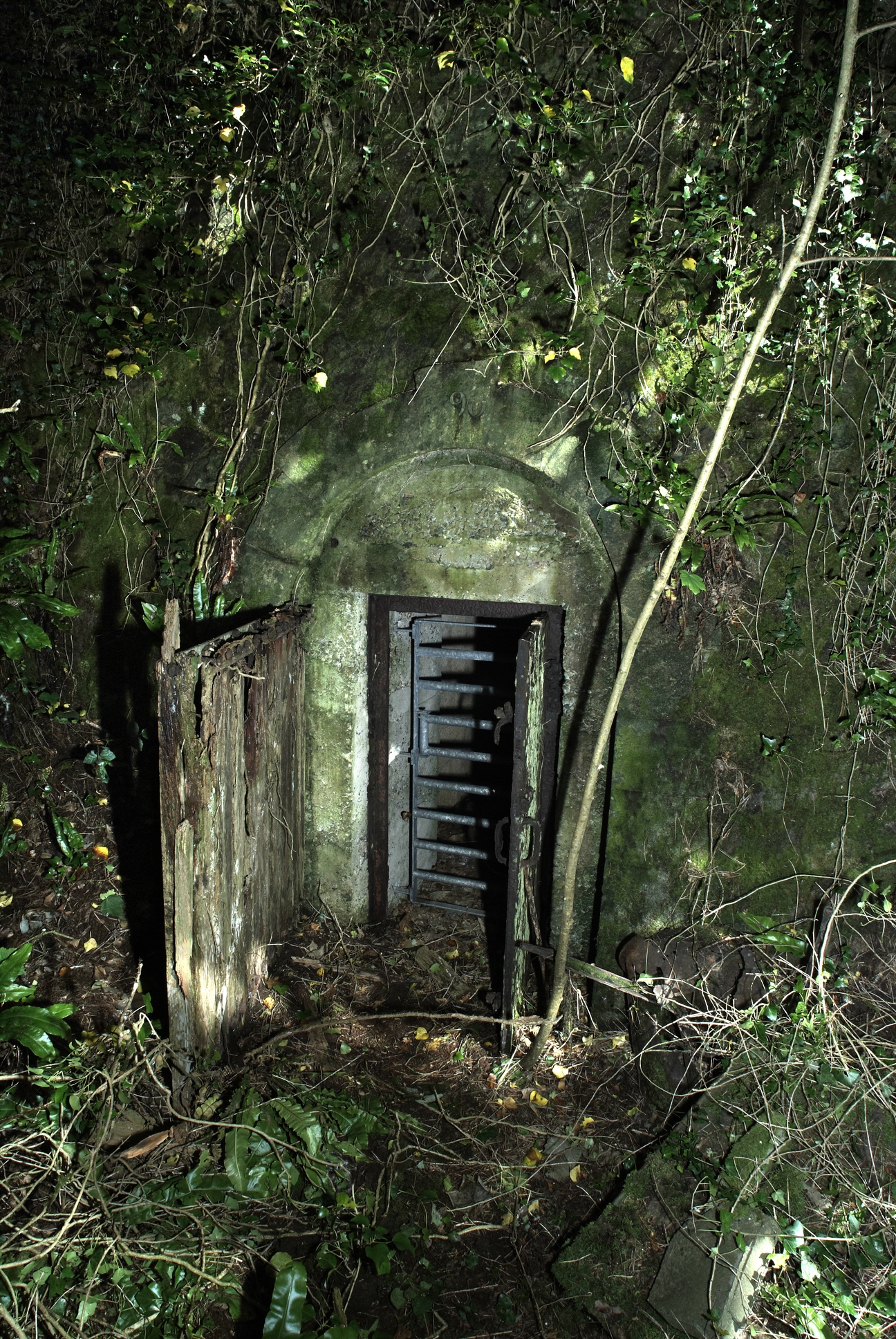 Plouzané, pointe du Minou (Kerangoff) : batterie du Sémaphore, magasin à poudre sous roc (1890), accès piéton. Il a conservé du matériel de second oeuvre : grille défensive, porte, rail et treuilImmatriculation