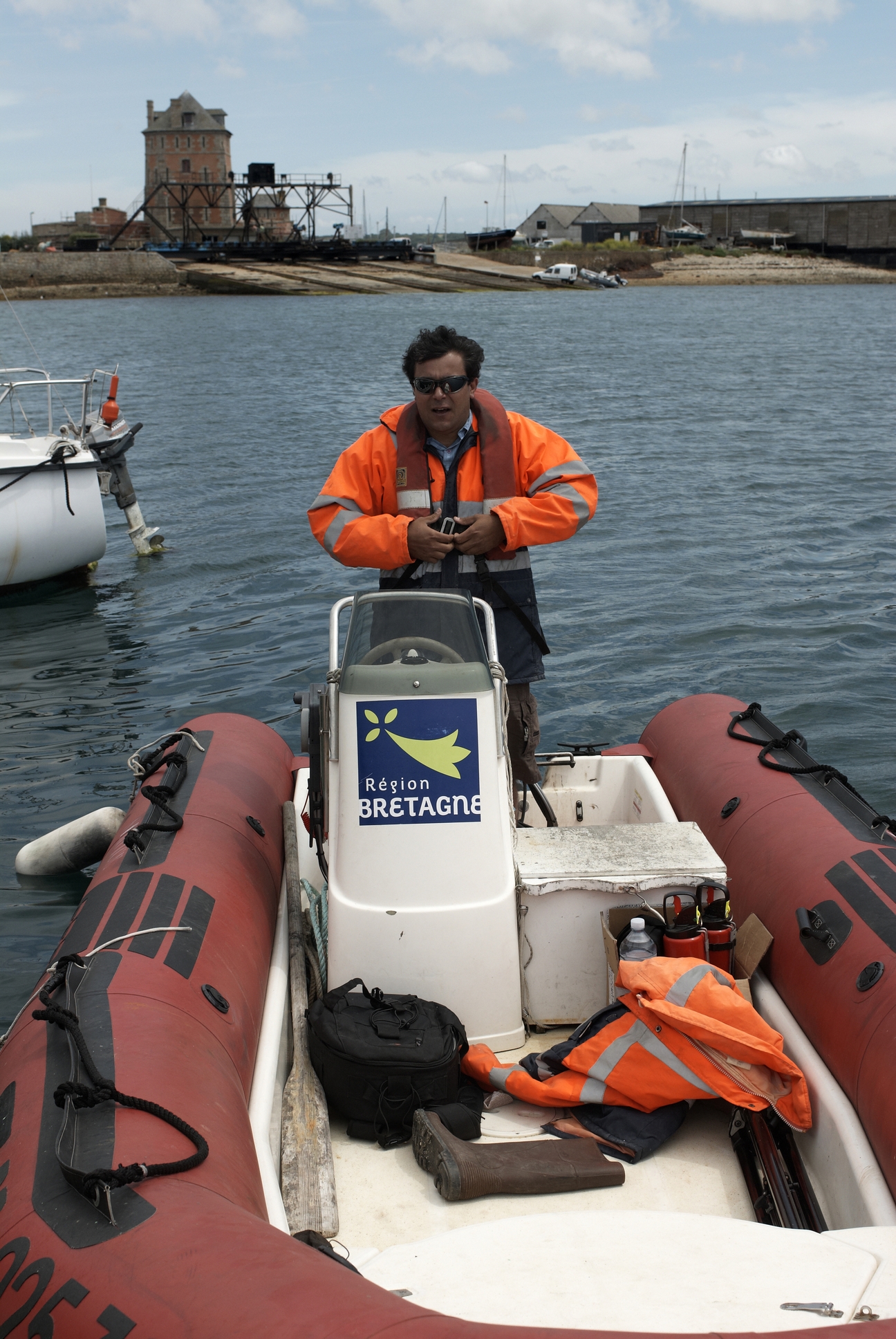 Camaret-sur-Mer : Guillaume Lécuillier, chargé d'études d'Inventaire pilote le semi-rigide mis à disposition par le port de Brest lors de la couverture photographique en 2009. En arrière-plan : la Tour VaubanImmatriculation