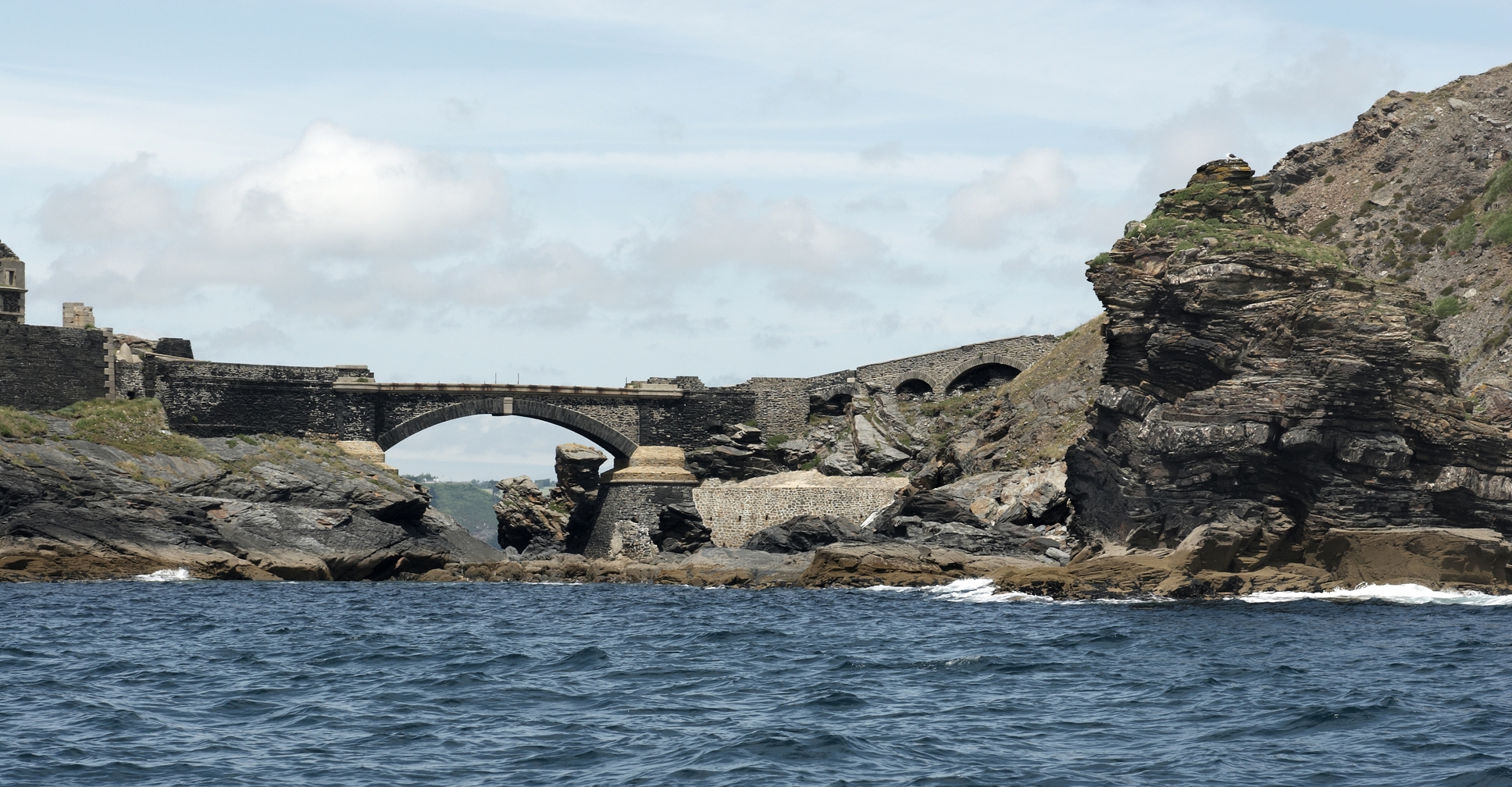 Roscanvel : vue de l'ensemble fortifié de l'îlot des Capucins depuis la mer, face sud, le pontImmatriculation
