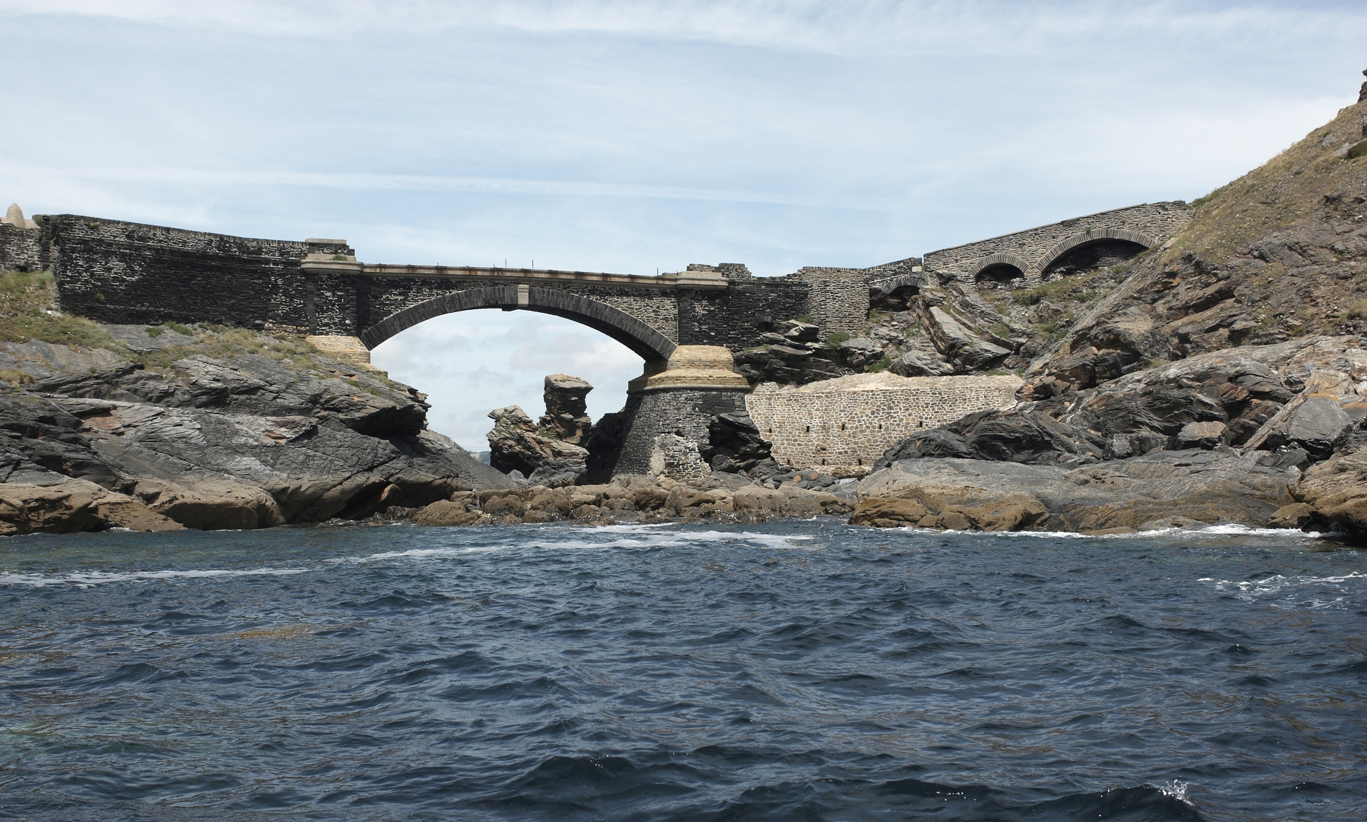 Roscanvel : vue de l'ensemble fortifié de l'îlot des Capucins depuis la mer, face sud, le pontImmatriculation