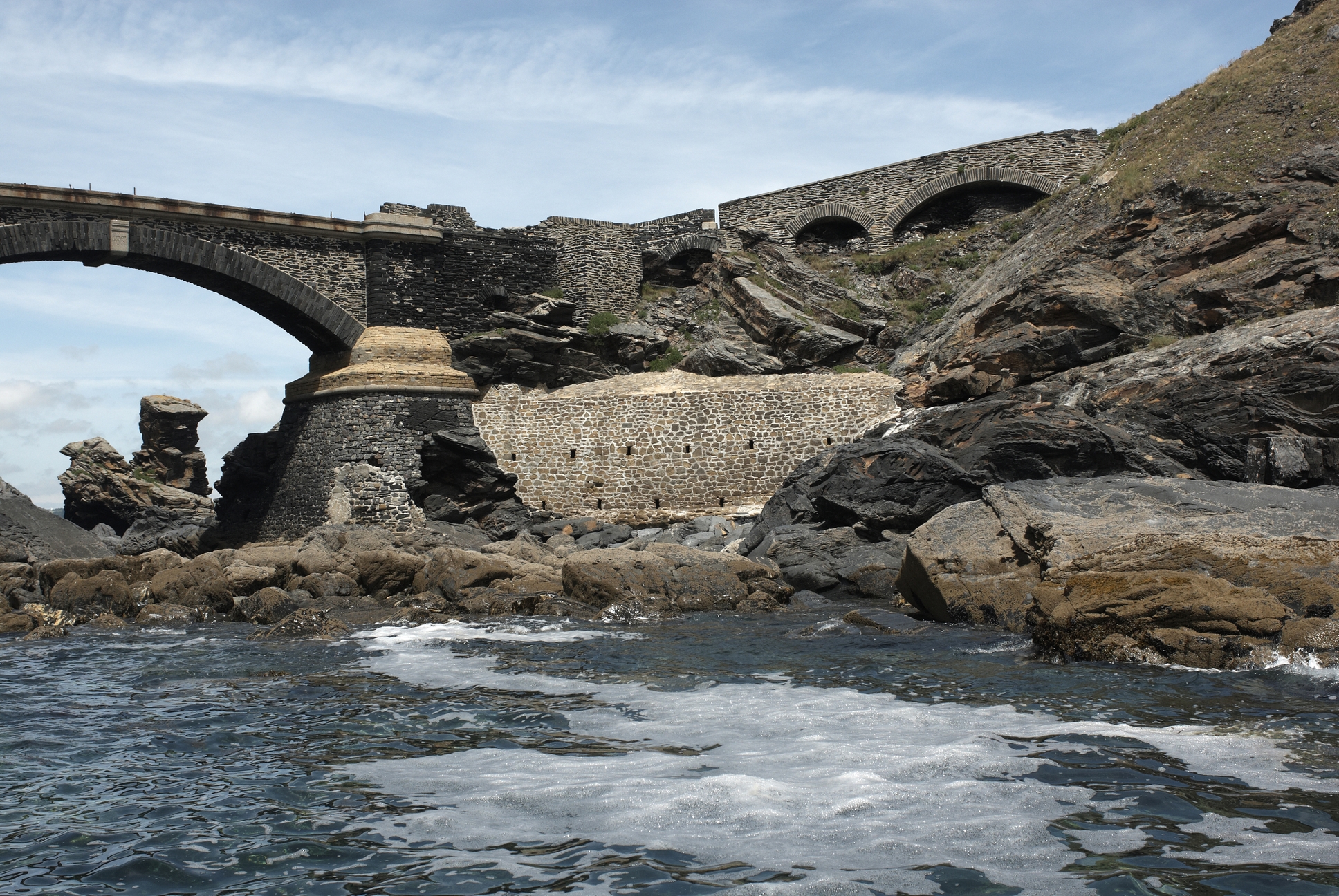 Roscanvel : vue de l'ensemble fortifié de l'îlot des Capucins depuis la mer, face sud, le pontImmatriculation
