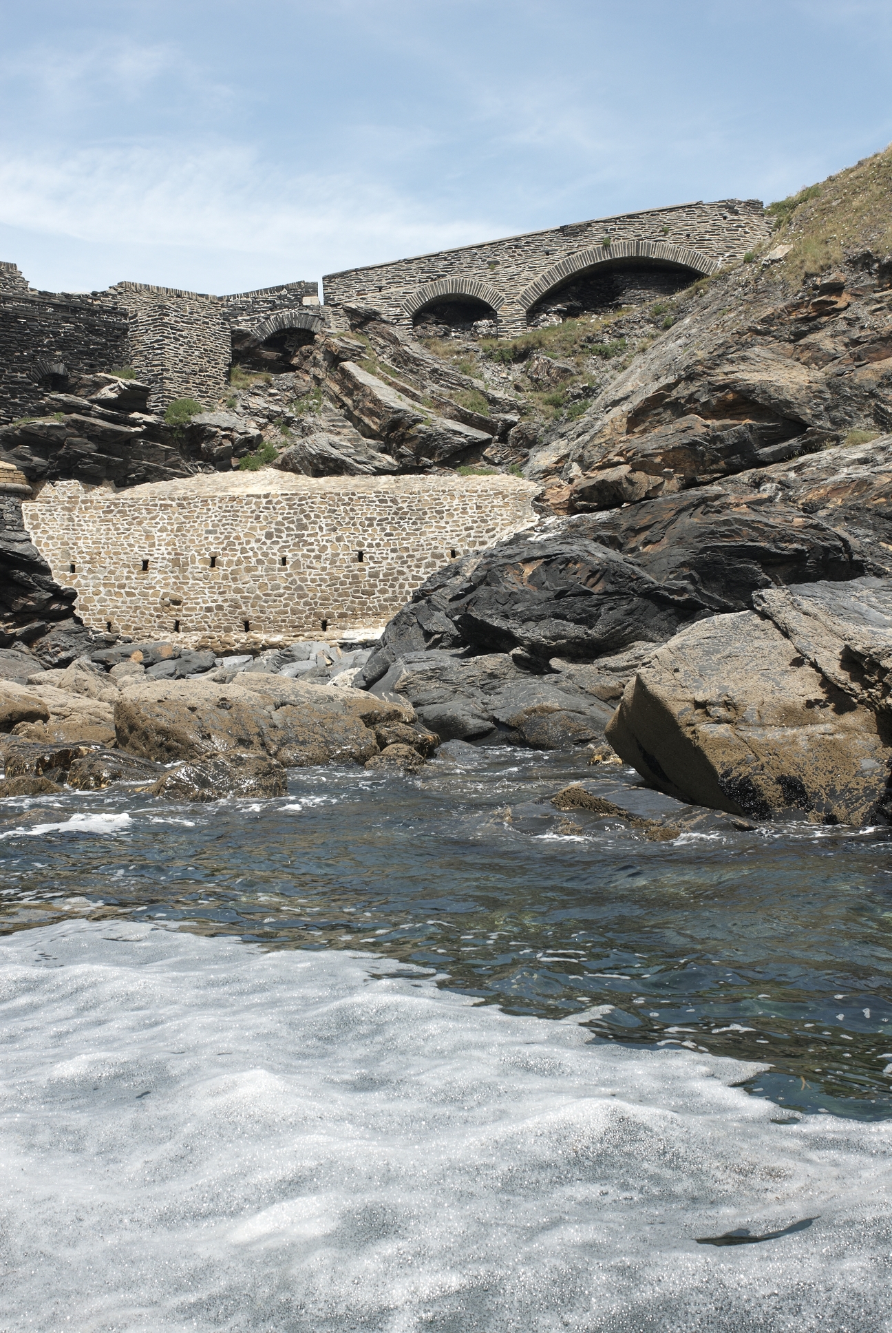 Roscanvel : vue de l'ensemble fortifié de l'îlot des Capucins depuis la mer, face sud, le pontImmatriculation