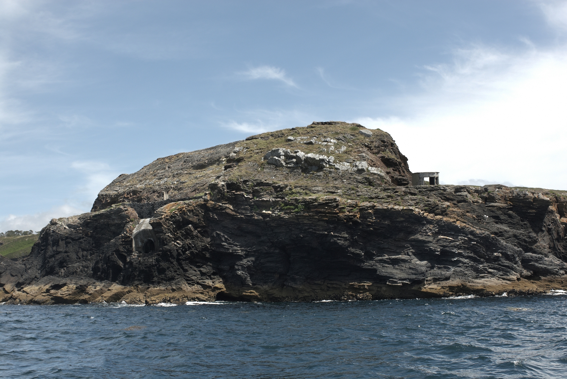 Roscanvel : vue de l'ensemble fortifié de l'îlot des Capucins depuis la mer, face ouest, abri sous roc et abri de combat du projecteurImmatriculation