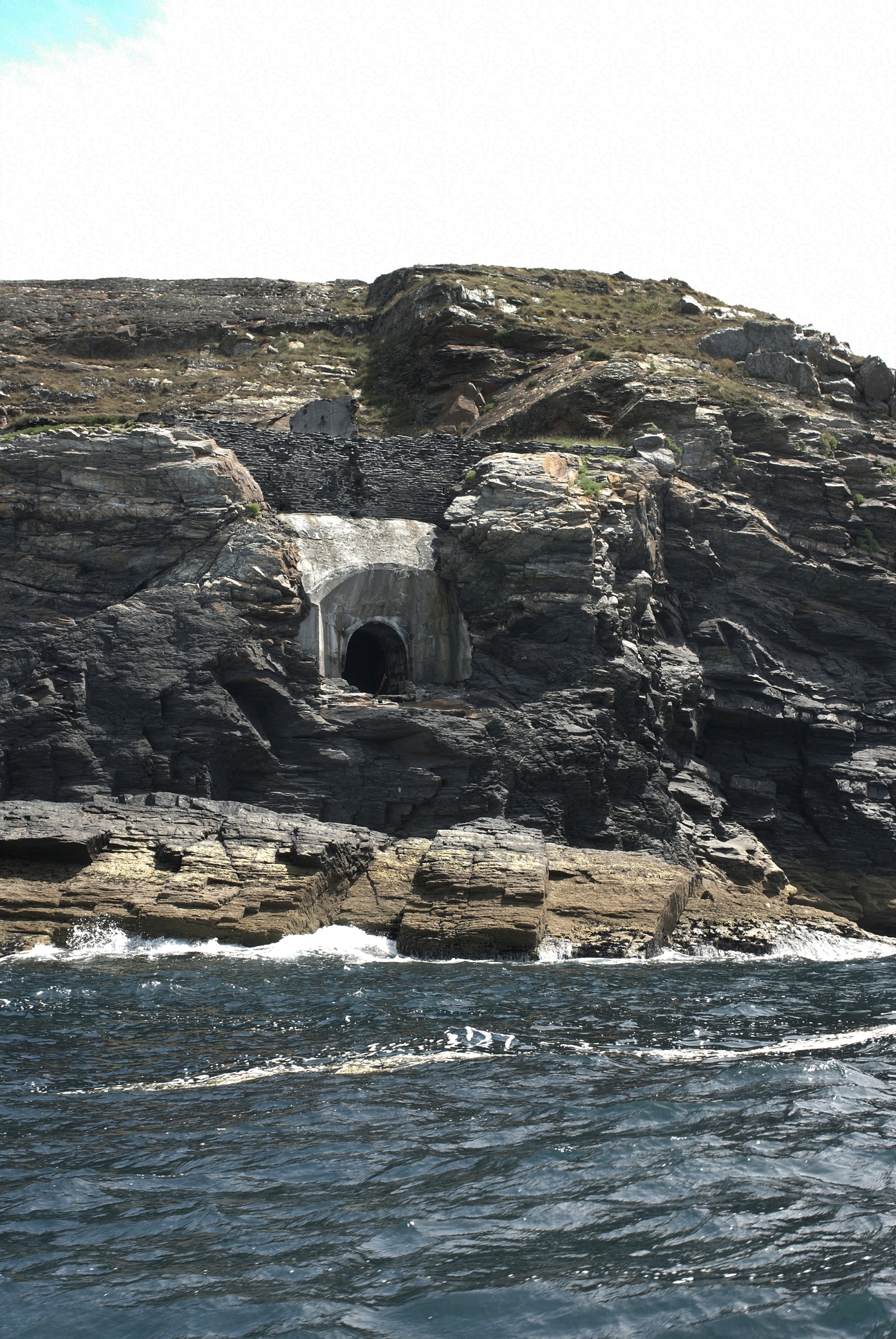 Roscanvel : vue de l'ensemble fortifié de l'îlot des Capucins depuis la mer, face nord, abri sous roc du projecteurImmatriculation
