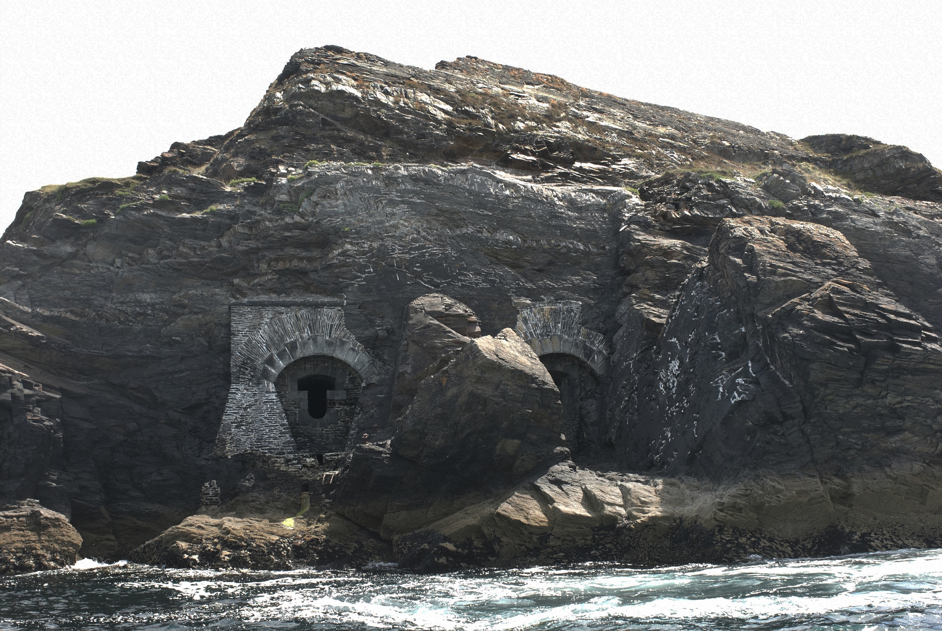 Roscanvel : vue de l'ensemble fortifié de l'îlot des Capucins depuis la mer, face nord, batterie de rupture, embrasuresImmatriculation