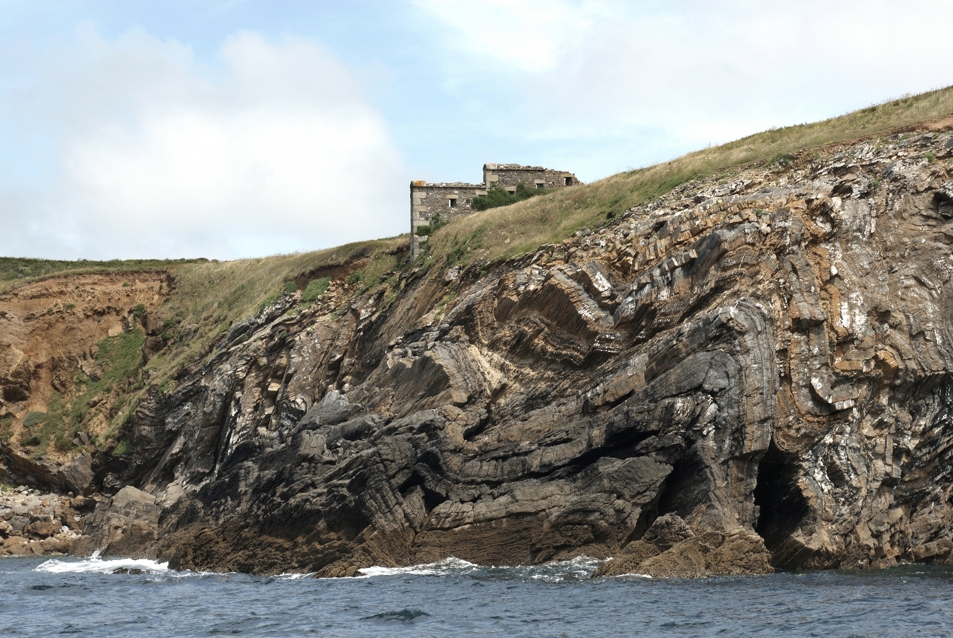 Roscanvel, pointe de la Fraternité : le fort de la Fraternité depuis la mer, mur défensif dit branche tombante percée de créneaux de fusilladeImmatriculation