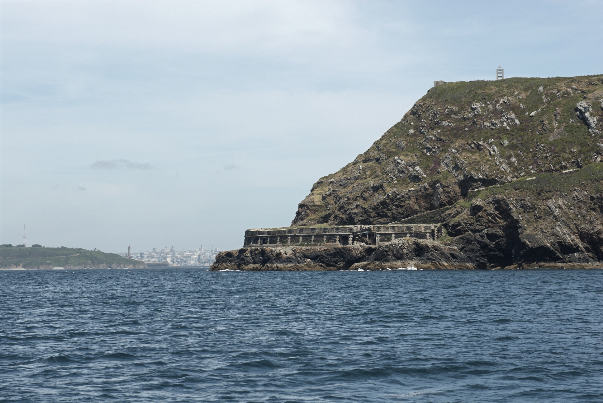 Roscanvel, pointe de Cornouaille : la batterie basse depuis la mer. En arrière plan : la ville de BrestImmatriculation