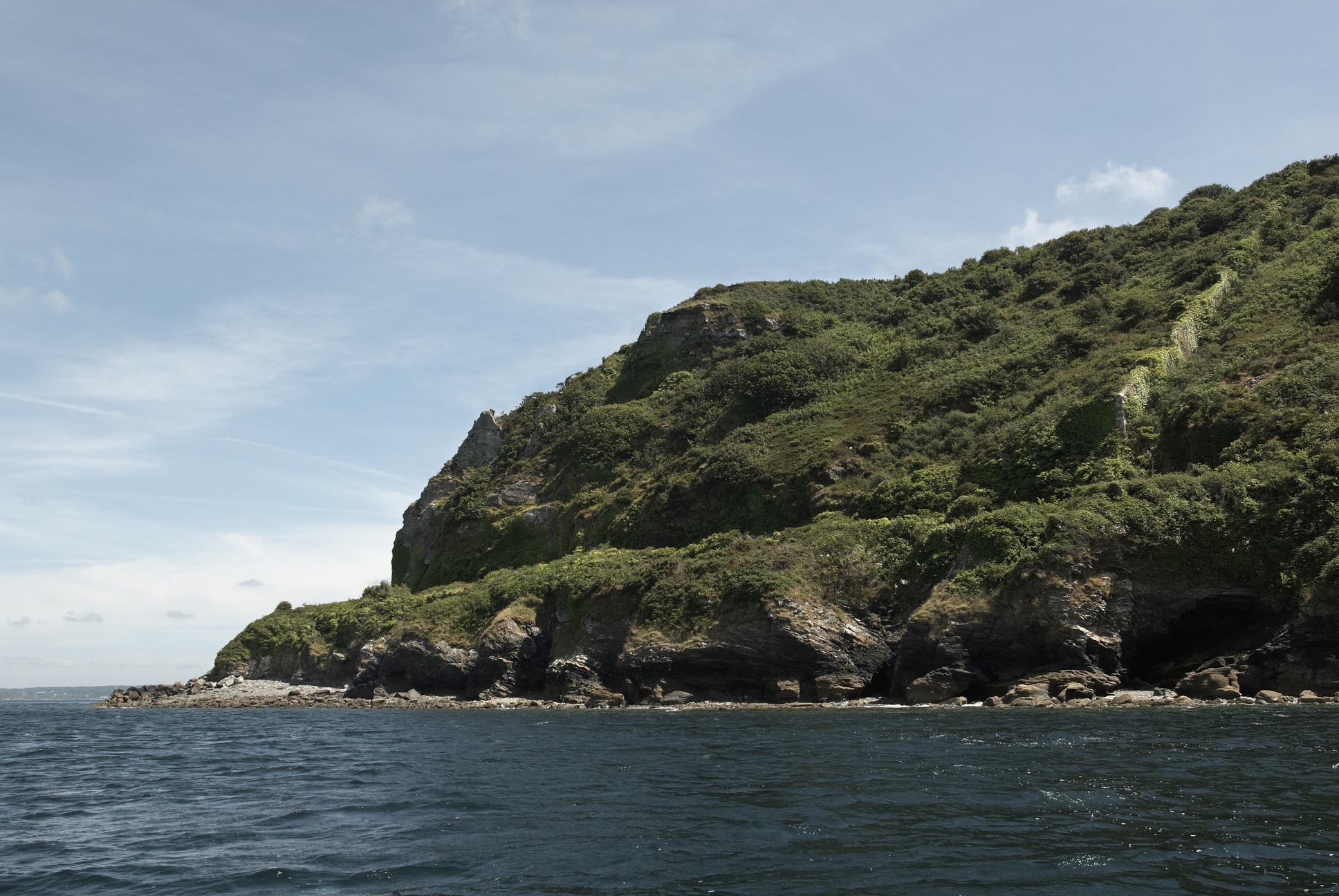 Roscanvel : vue de la pointe des Espagnols, batterie basse et casernements depuis la mer. A droite : mur défensif dit branche tombante envahie par la végétationImmatriculation