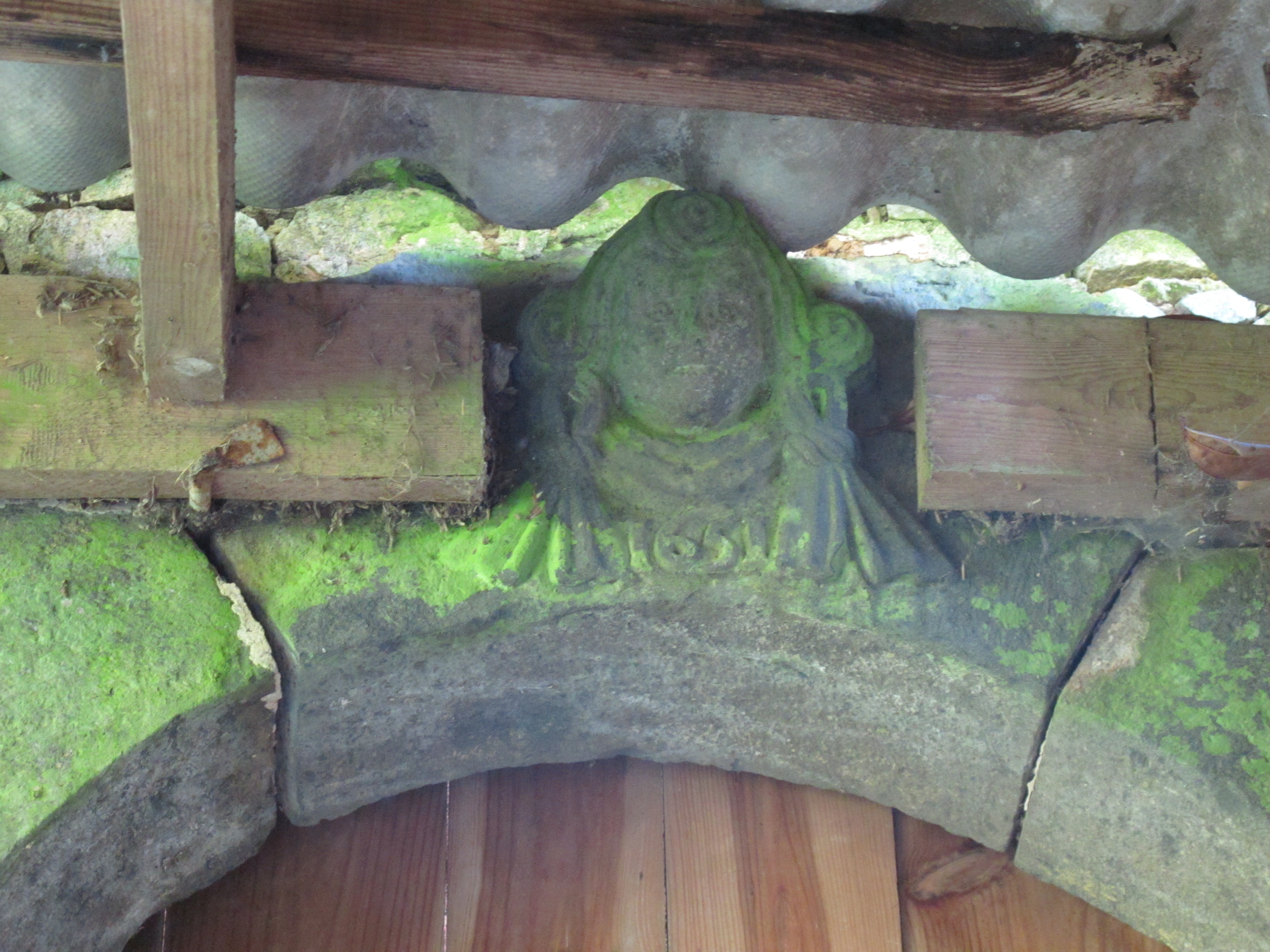 Pen ar hoat, façade nord, détail encadrement de porte, tête sculptée, date 1651Immatriculation