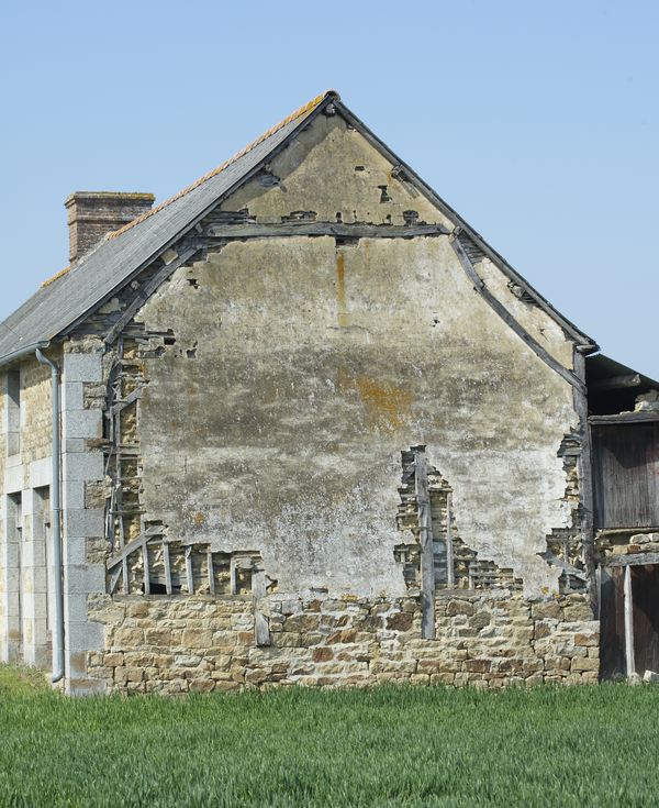 Détail du pignon en pan de bois sur soubassement en pierreImmatriculation