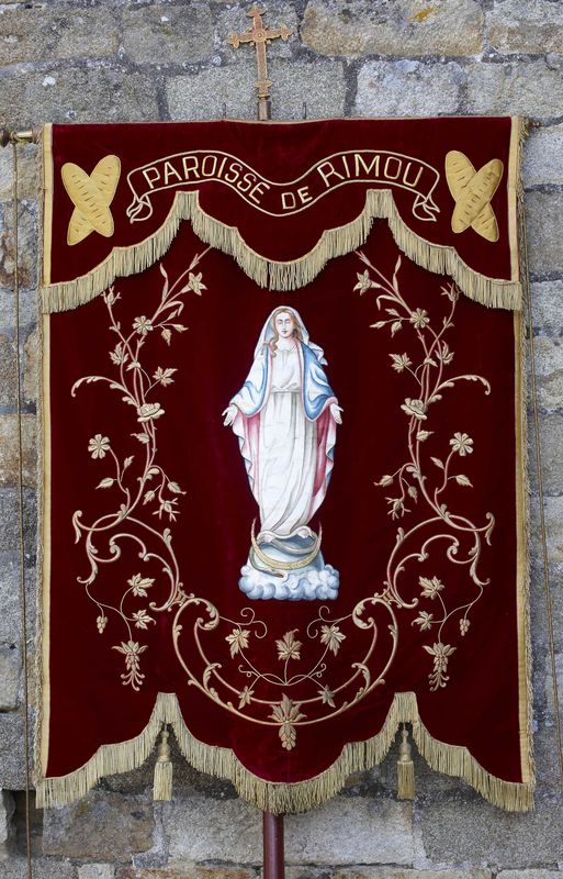 Ensemble de 2 bannières de procession : Christ en croix ; Immaculée Conception ; Sacré Coeur (Rimou),