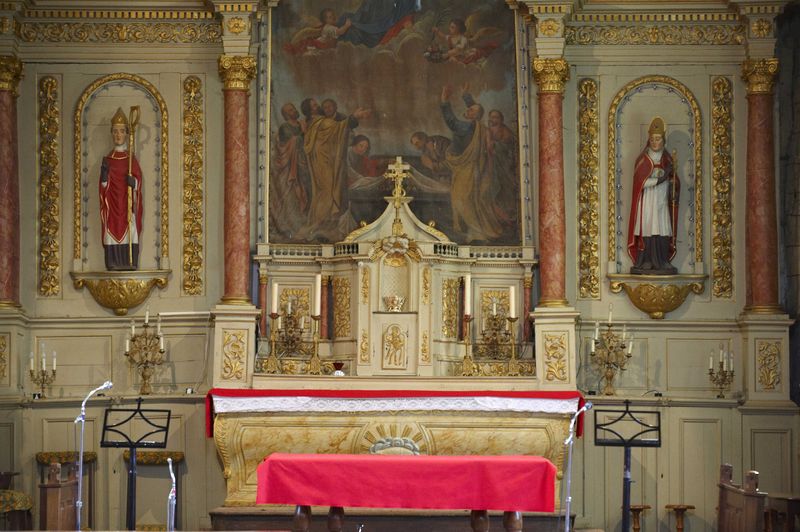 Ensemble du maître-autel : autel, retable, tabernacle, 2 gradins d'autel, 2 degrés d'autel (Rimou),
