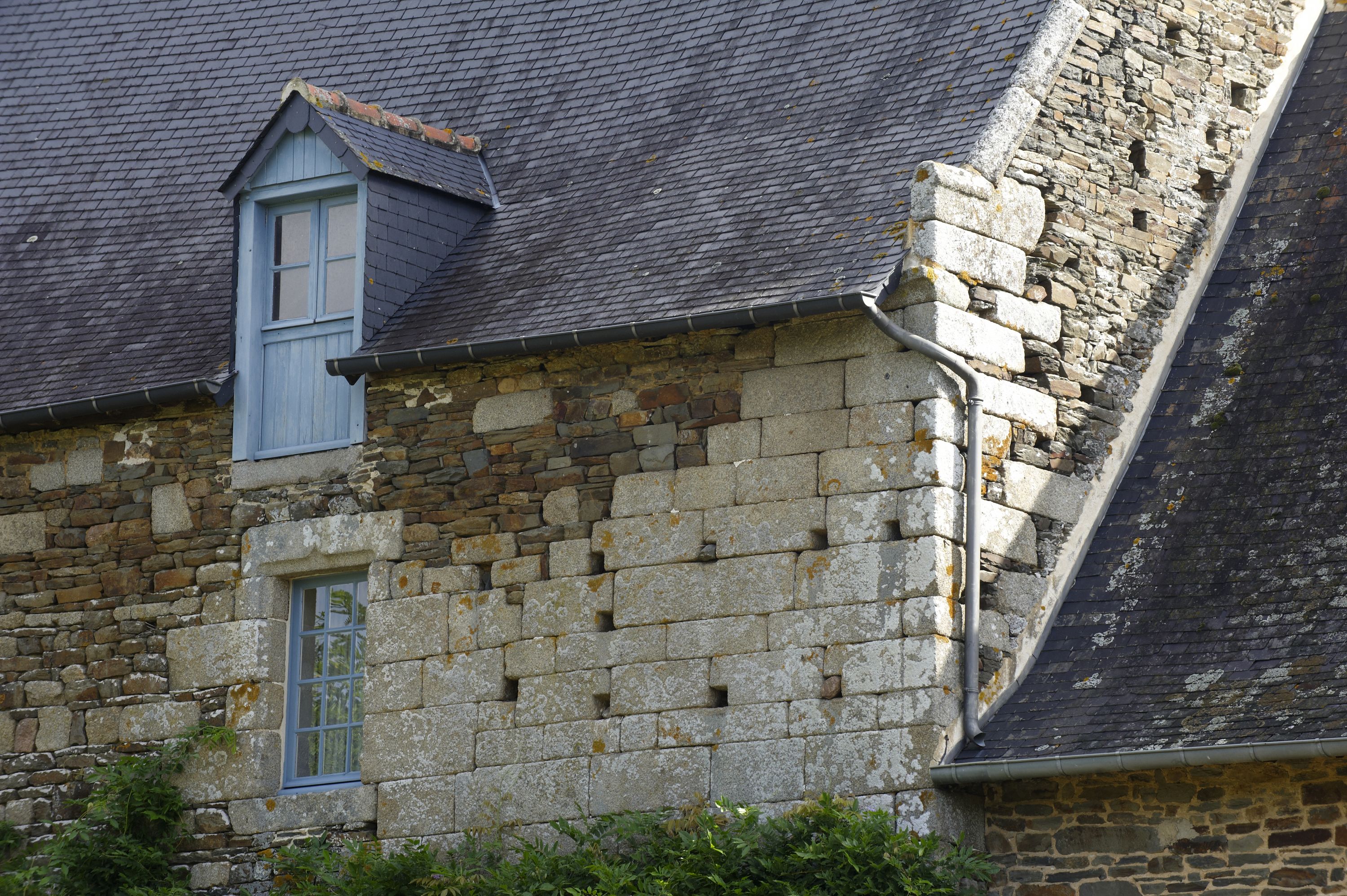 Détail de la mise en oeuvre du manoir, mélange de pierre de taille et de moellonImmatriculation