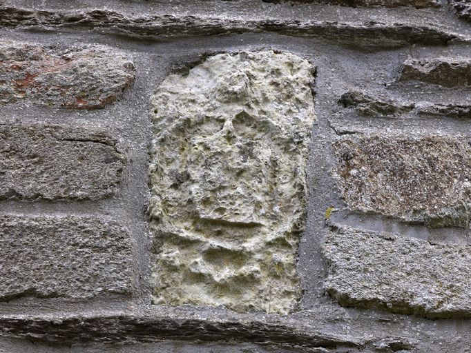 Chapelle, mur ouest : pierre portant des armoiries illisibles (état en 2012)Immatriculation