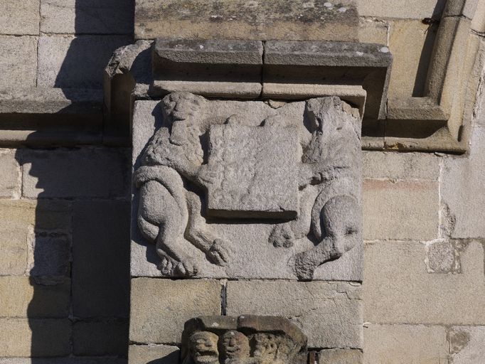 Église, élévation sud, 2e contrefort à partir de l'ouest : deux lions portent un écu carré dont les armoiries ont été martelées (état en 2012)Immatriculation